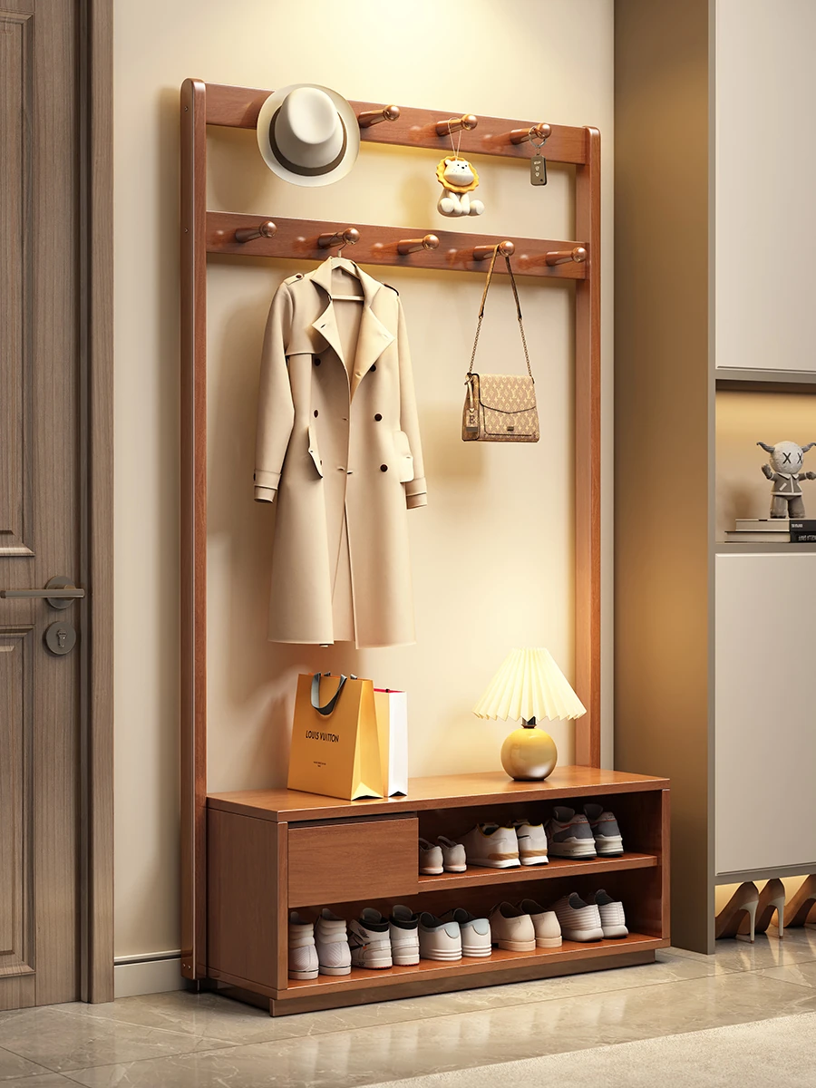 天然木材使用!機能的なコートハンガー&シューズキャビネット一体型収納ラック - 自宅でスタイリッシュにおしゃれに!リビングや寝室にぴったりの落ち着いたデザイン。多機能収納でお部屋をスッキリ整えます!