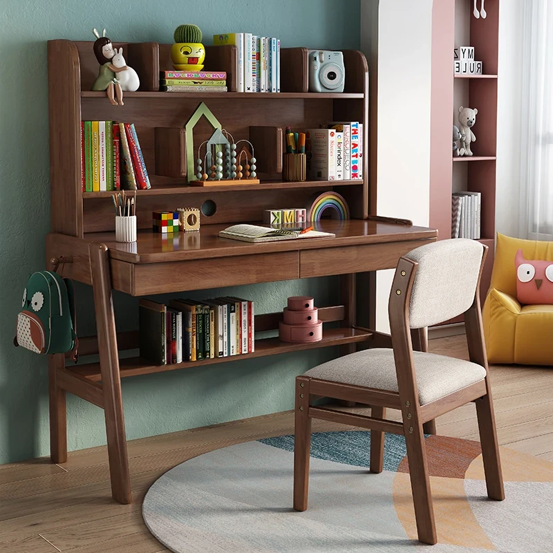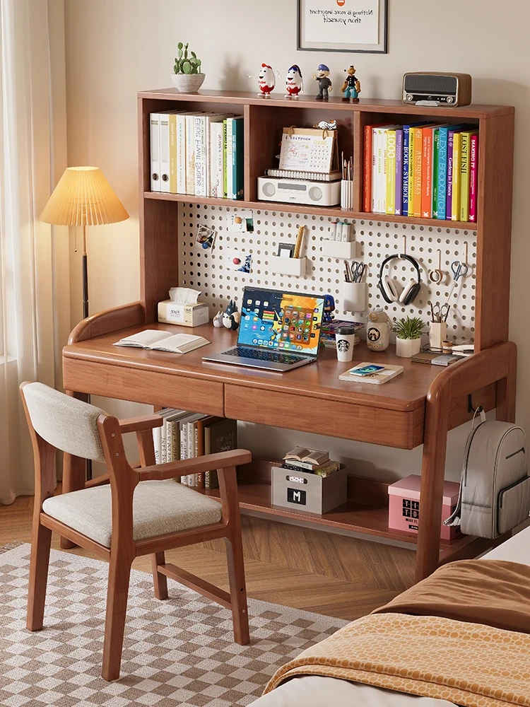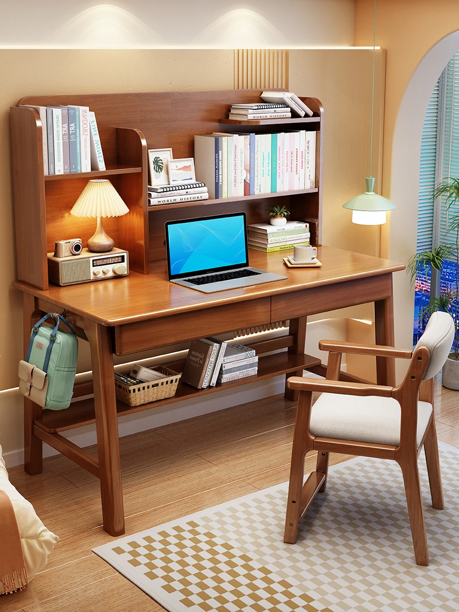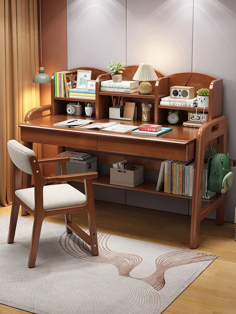 天然木材使用!子供向けのスタイリッシュな学習デスク、書架付きの家用オフィスデスク。快適なワークスペースを提供するデザイン。中高生向けの勉強に最適!【実木書桌・書架付・子供の学習デスク】