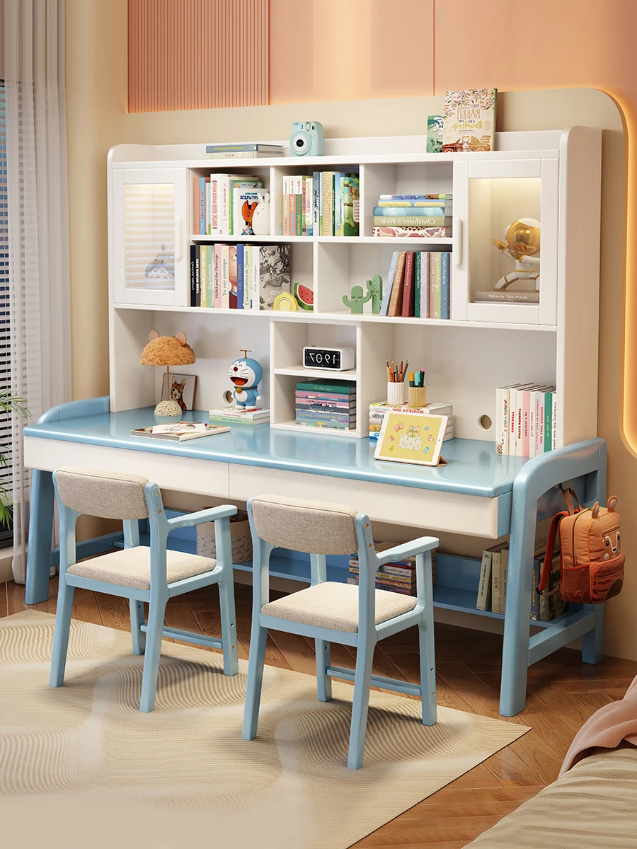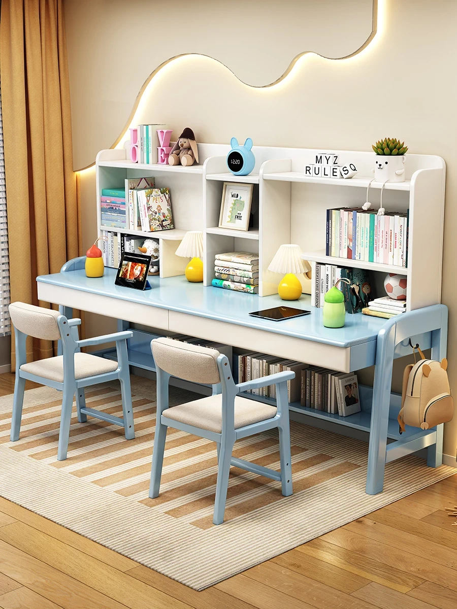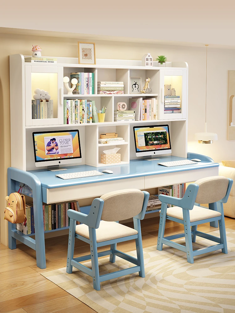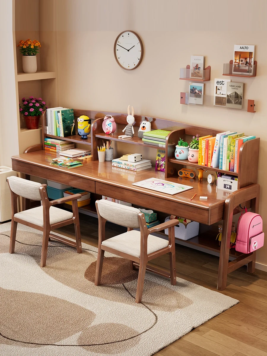 デザイン性抜群!実木製の二人用子供用学習デスク&本棚一体型、並んで楽しく勉強できる小学生向け、家庭用寝室にも最適なコンピュータデスク!