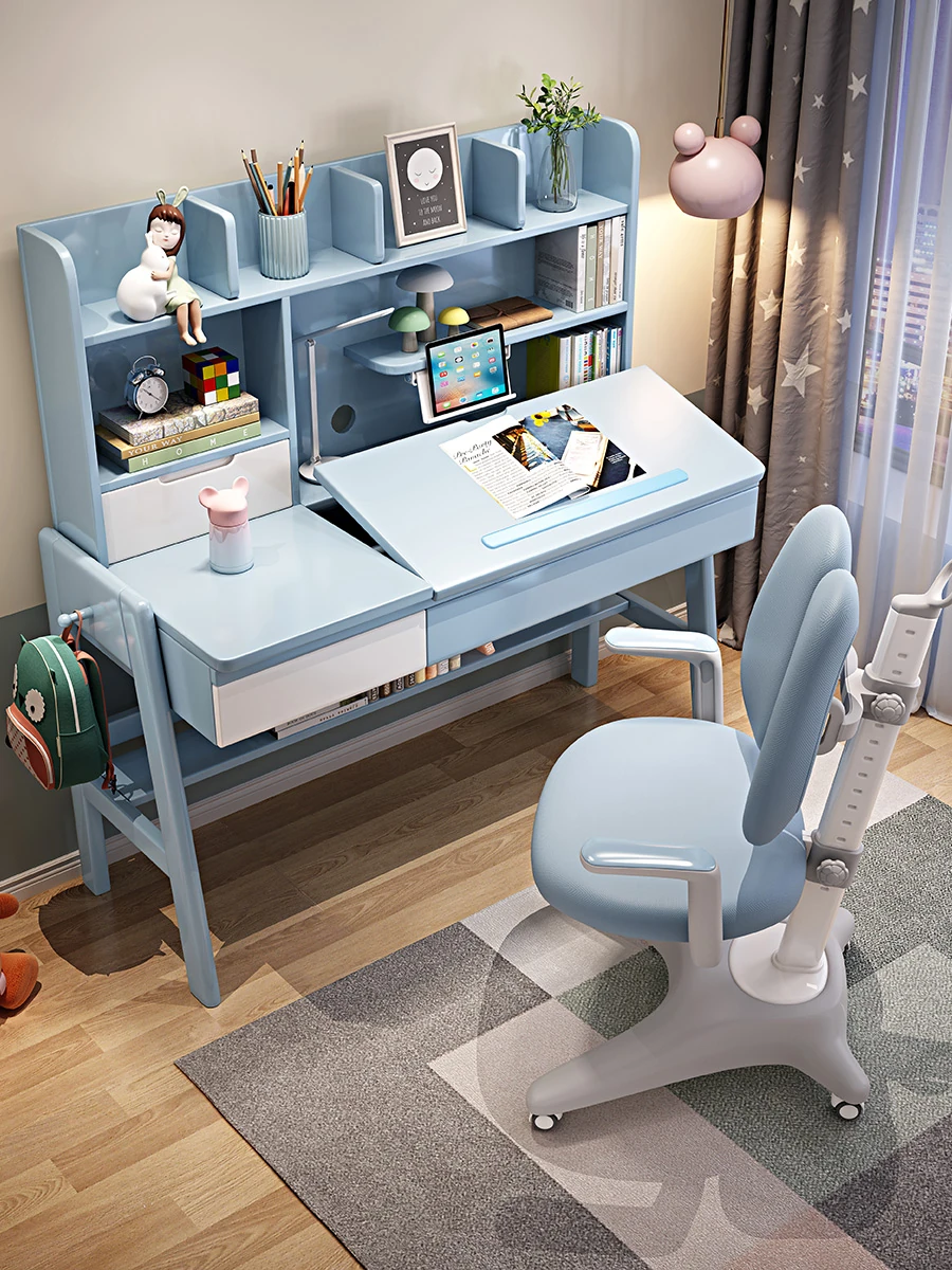 昇降式無垢材子供用学習デスク|家庭用・寝室・ベッドサイドに最適!小学生のための快適な勉強環境を提供!宿題もぬかりなくサポートする、スタイリッシュな机と椅子セット!