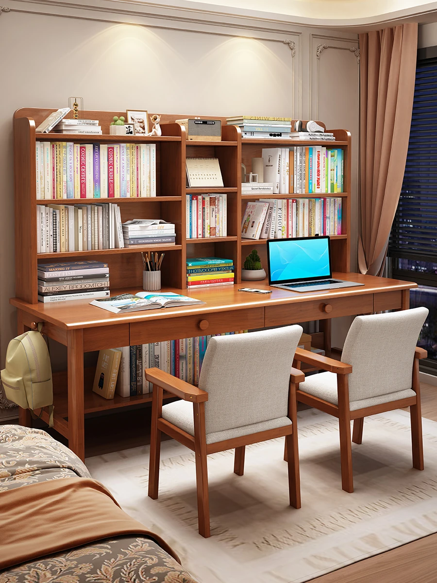 天然木材のダブルデスク&本棚セット|学生やお子様に最適!おしゃれで機能的なコンピューターデスクと寝室用の書棚が一体になった学習デスク。快適な勉強環境を提供します!