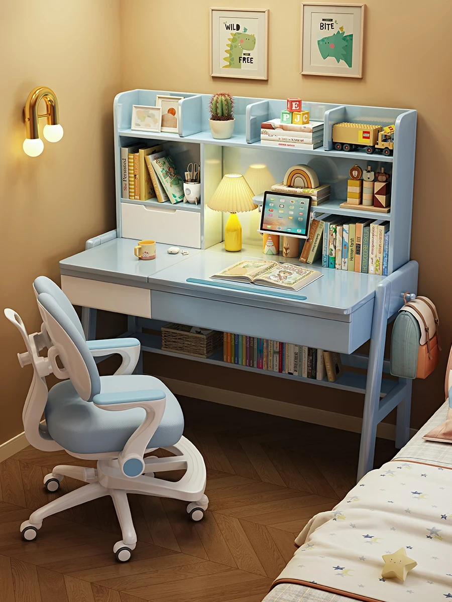 可調整高さの子供用書桌兼書架!小学生と中学生に最適なカラフルで優れたデザイン、天然木製の学習デスク&チェアセットで、快適な勉強環境を実現!
