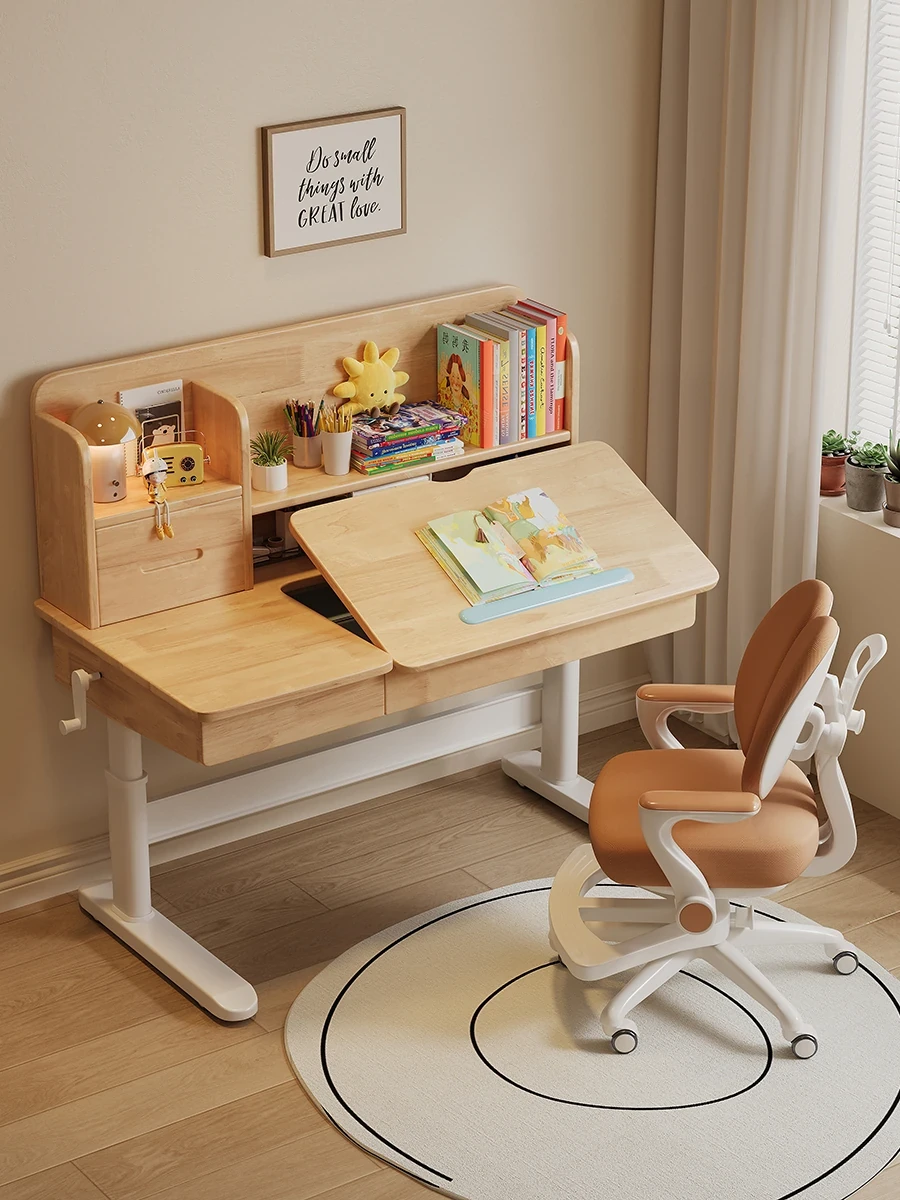 子供用無垢材学習デスクセット - 小学生向け昇降可能なスタイリッシュなデスクと椅子、寝室や家での宿題環境を完璧に整えます!快適な学習スペースを提供し、成長に合わせて調整可能!