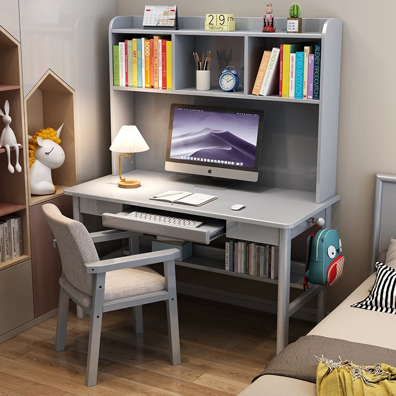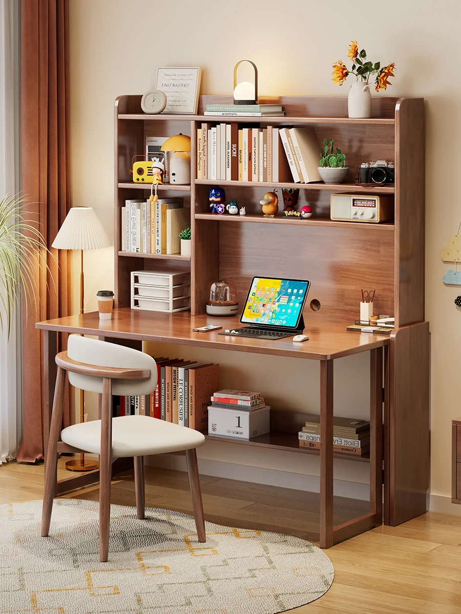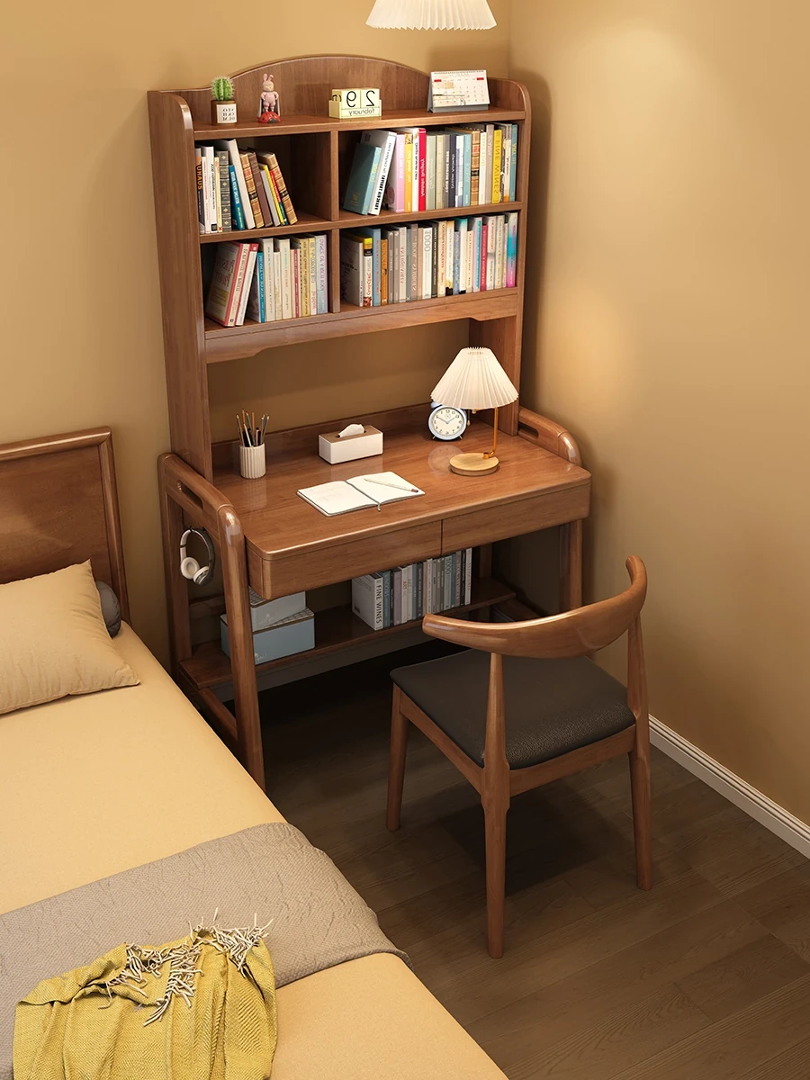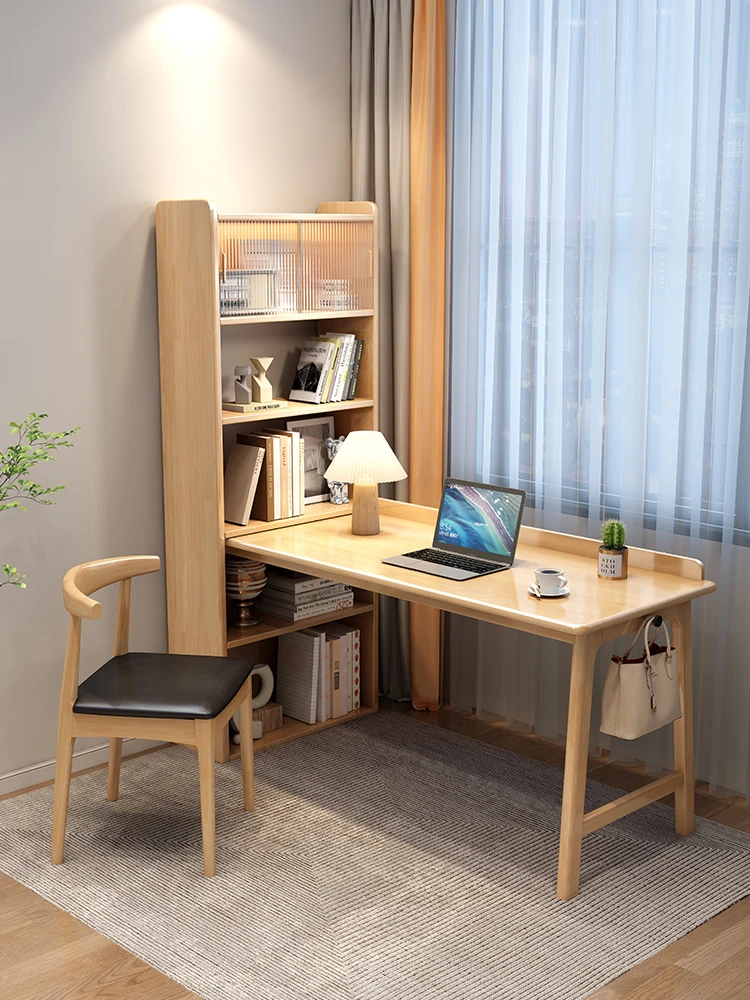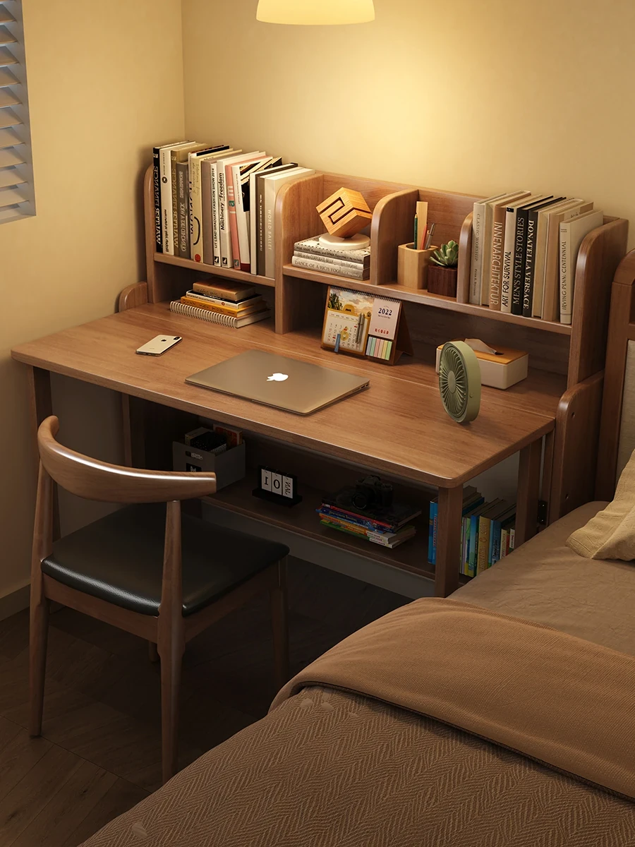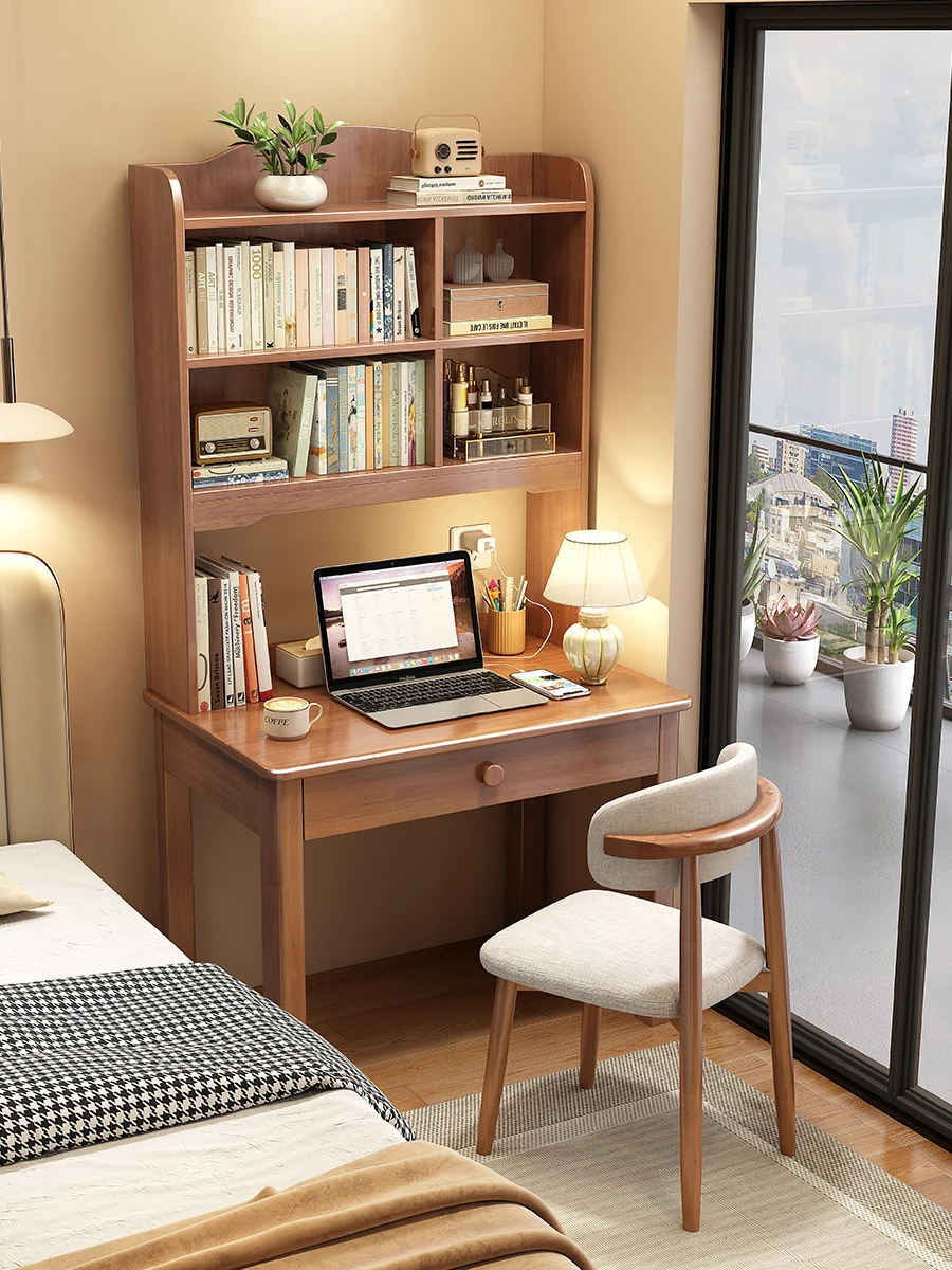 モダンシンプルな一体型無垢材デスク&本棚 - 小スペース向けノートパソコンデスク、学生の学習&執筆にも最適なベッドルーム用デスク。