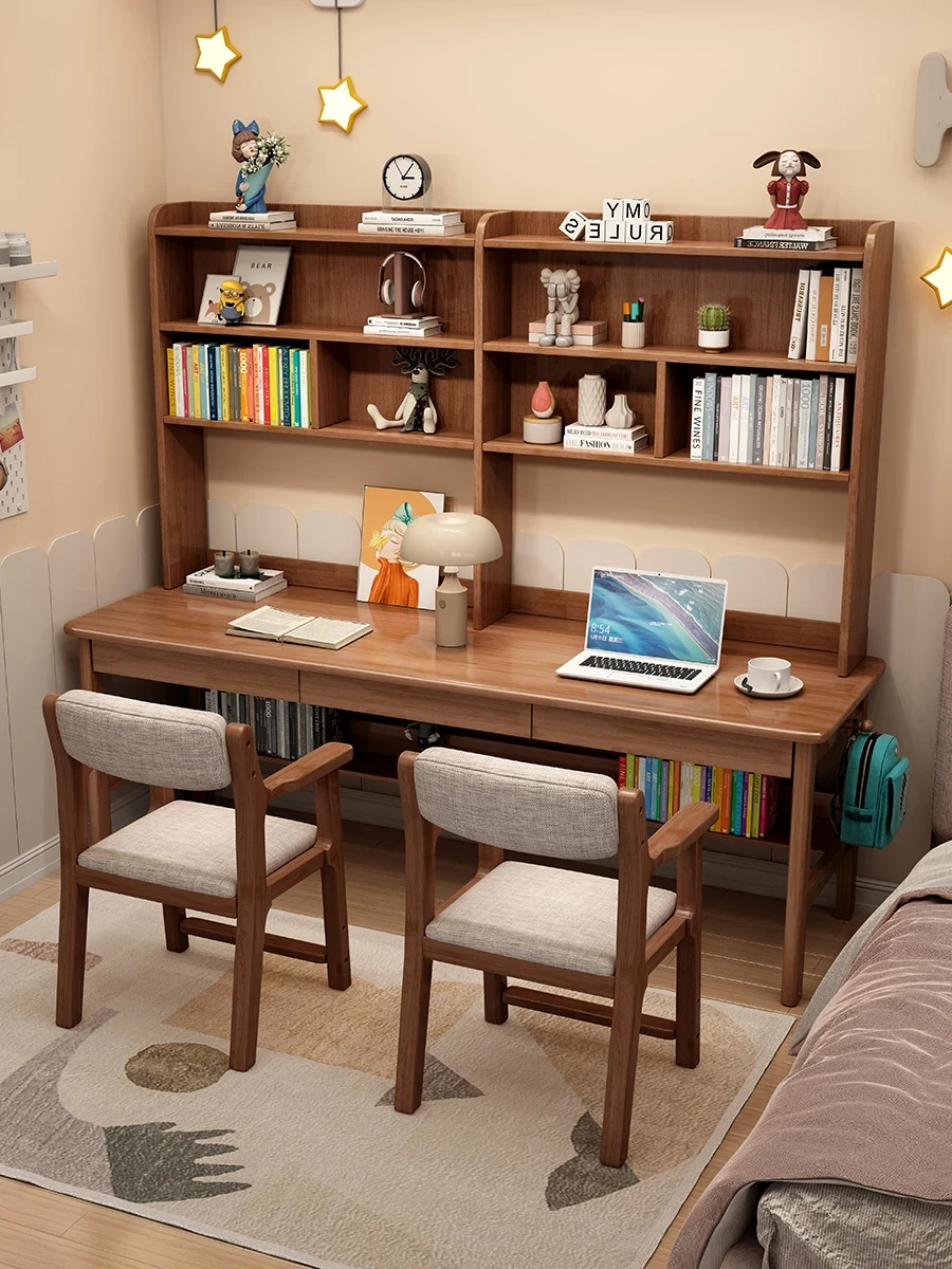 子供の学習をサポート!シンプルでスタイリッシュな本棚付き無垢材のデスクセット - 自宅学習や中学生向けにぴったりの2人用コンピューターデスク。快適な勉強環境を作り出します!