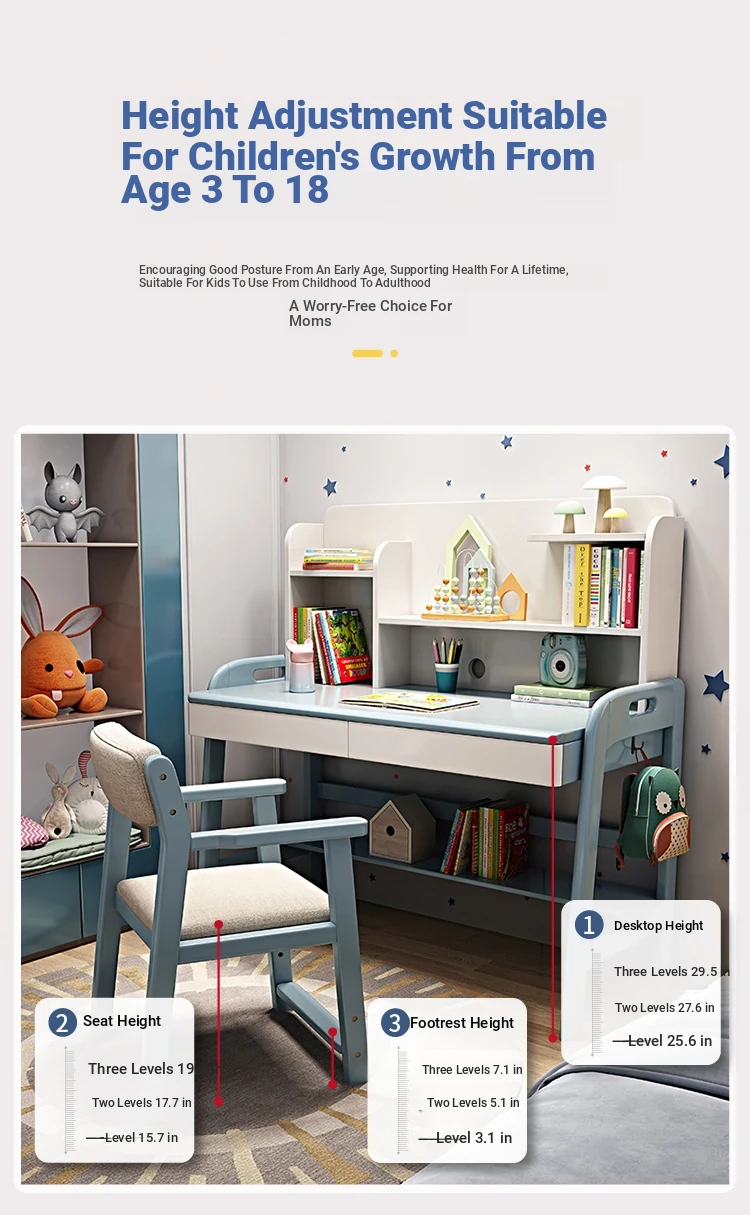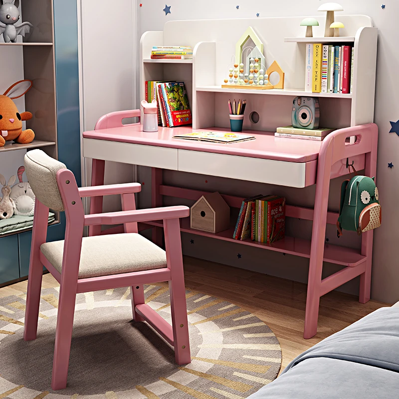 Children's Ergonomic Study Desk and Chair Set - Adjustable Solid Wood Writing Table with Bookshelf Combination for Kids' Room, Perfect for Elementary School Students