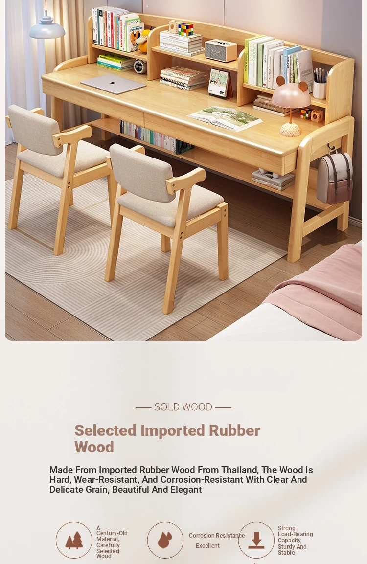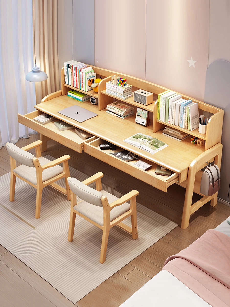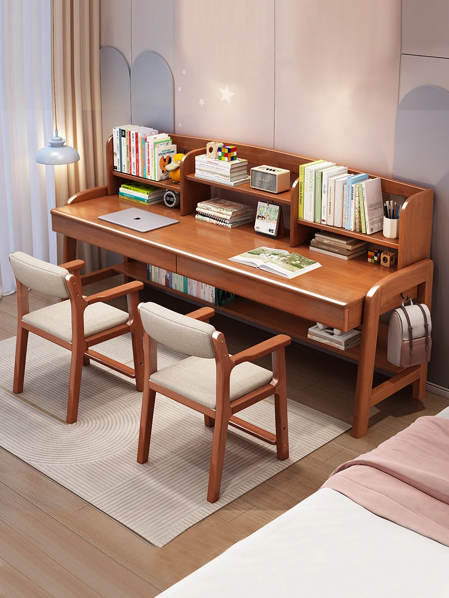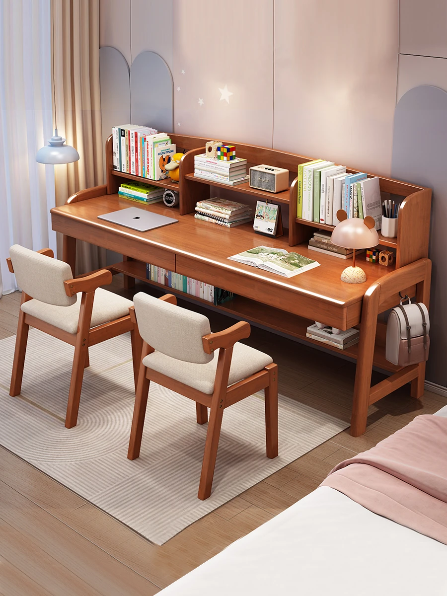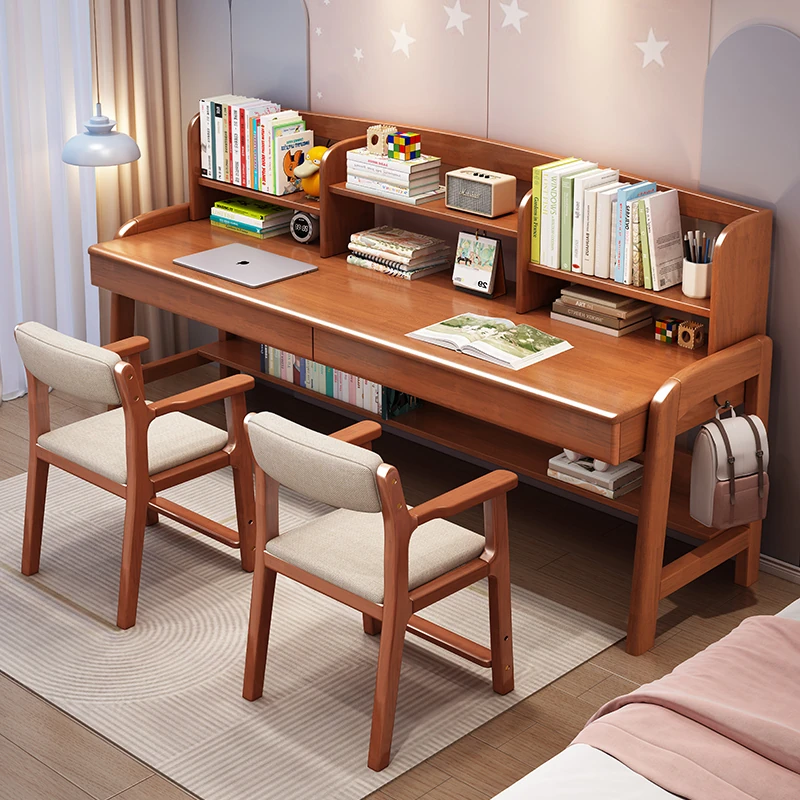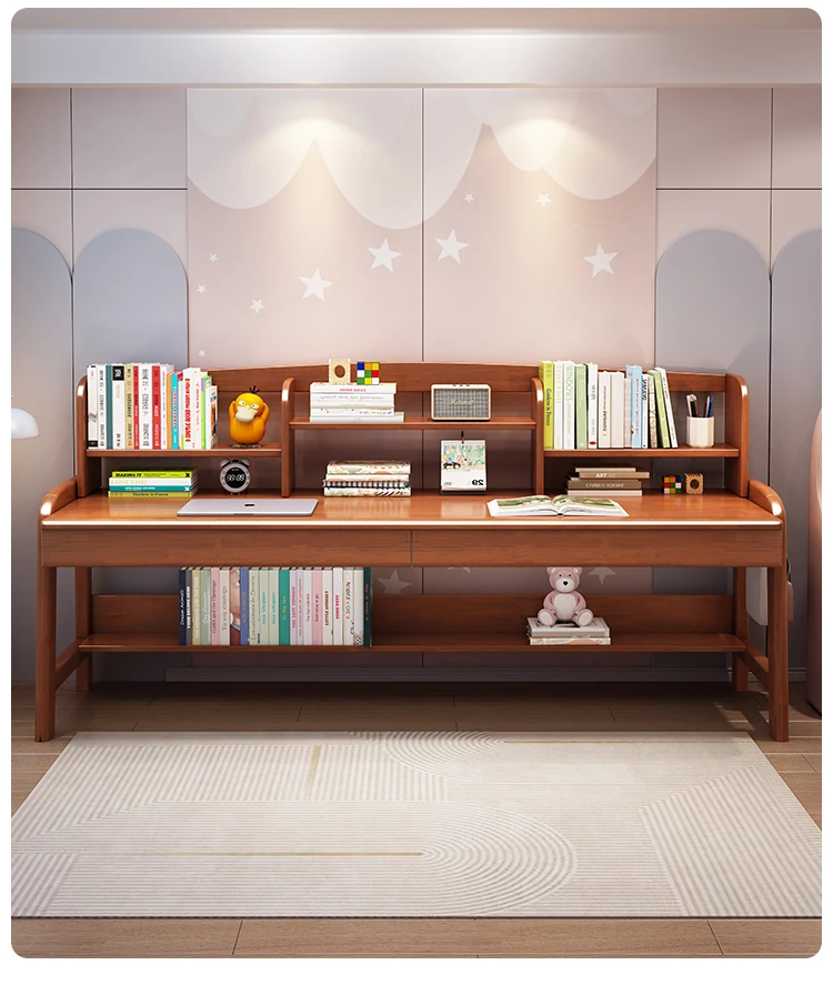 Extended Solid Wood Double Desk with Bookshelf - Ideal Learning Table for Kids and Teens, Perfect for Home or Living Room Use, Suitable for Writing and Study Sessions.