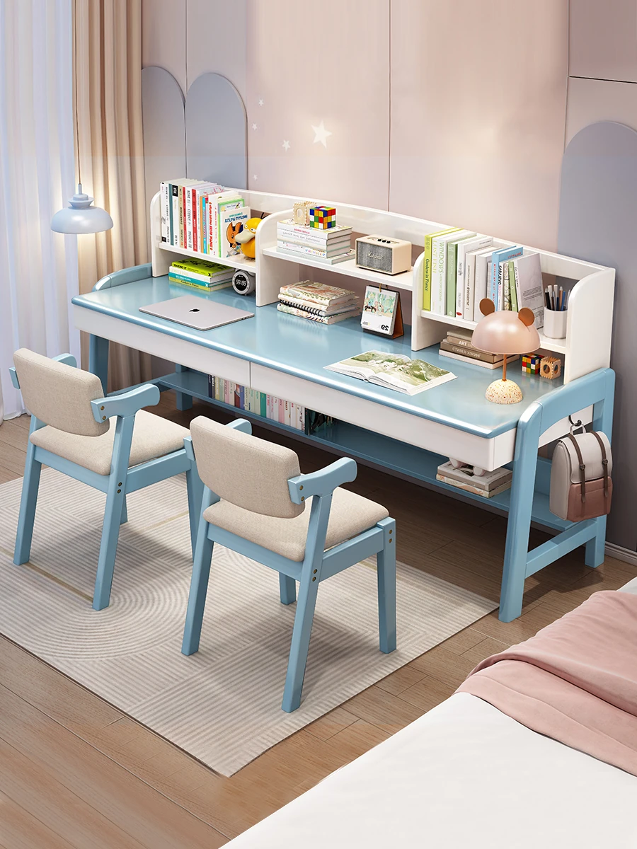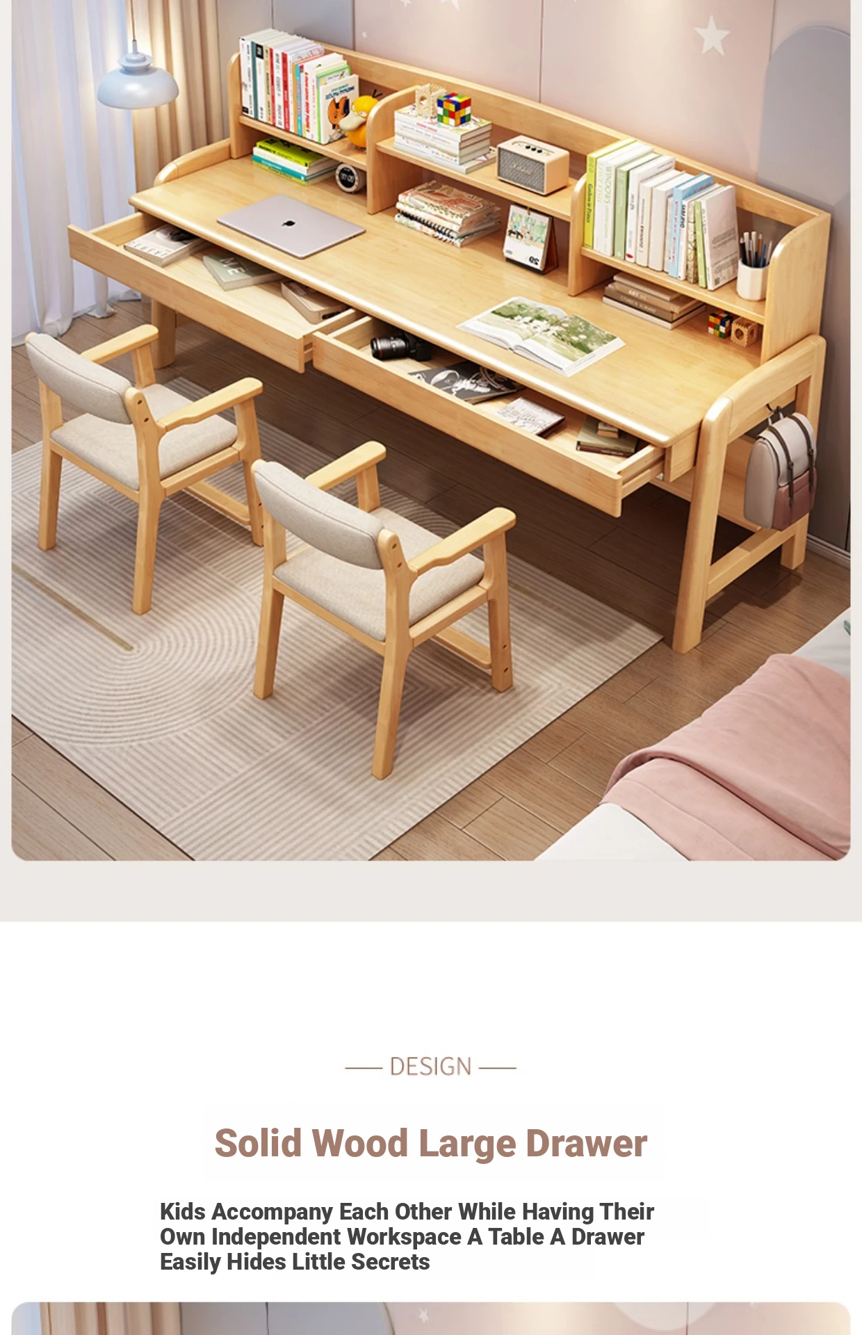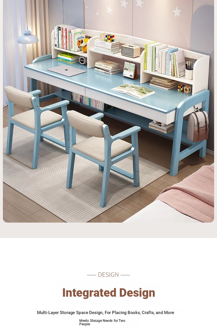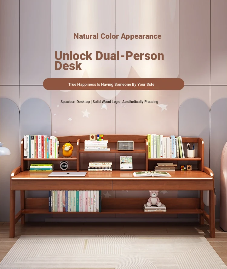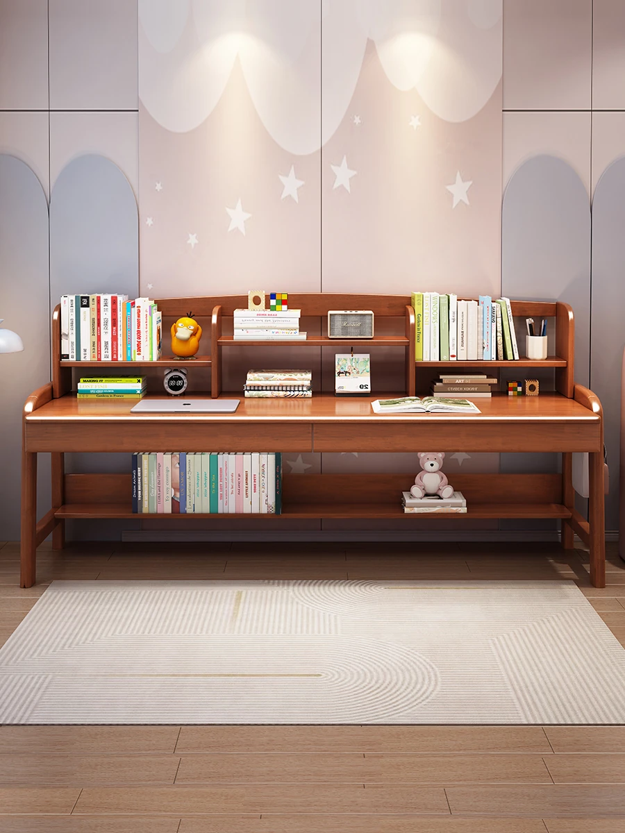 Extended Solid Wood Double Desk with Bookshelf - Ideal Learning Table for Kids and Teens, Perfect for Home or Living Room Use, Suitable for Writing and Study Sessions.
