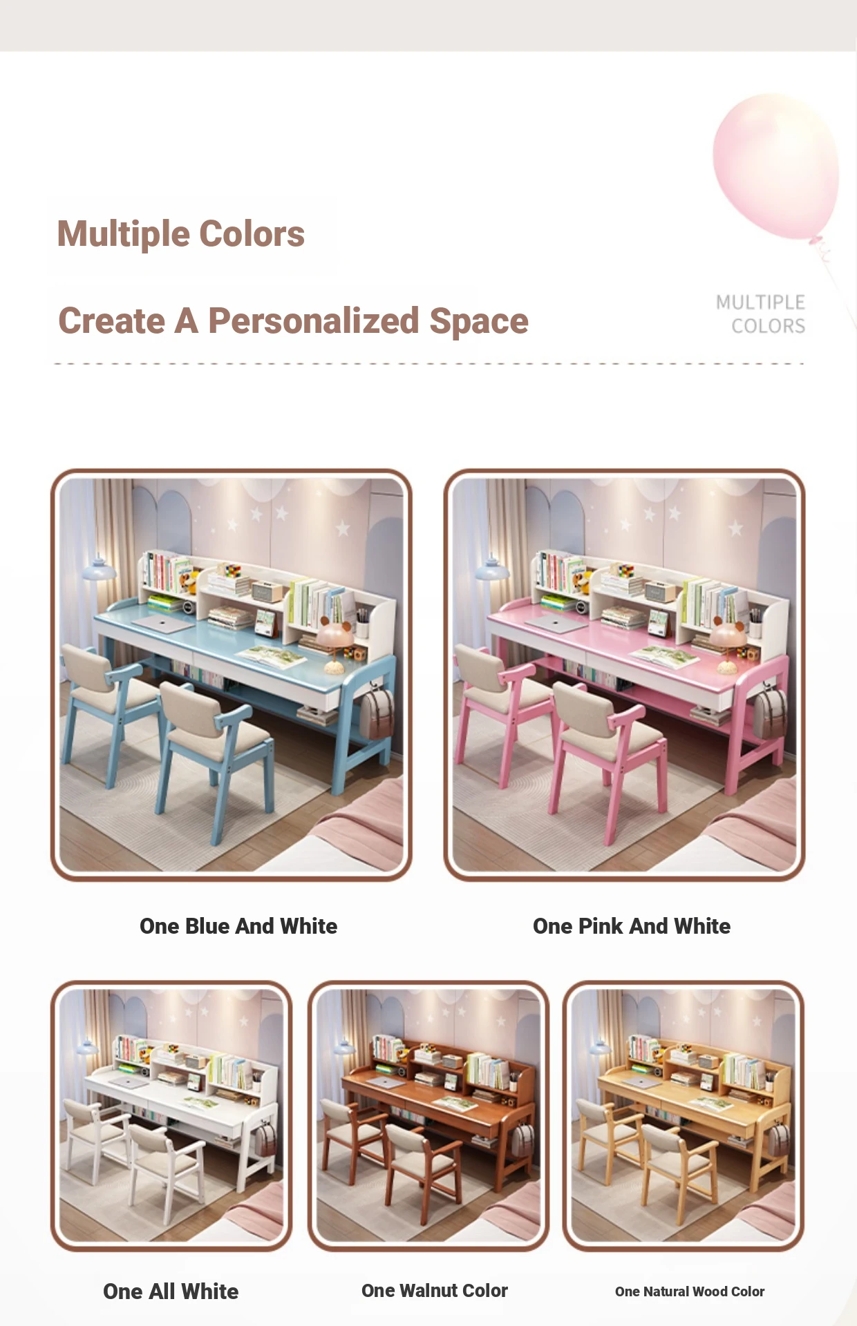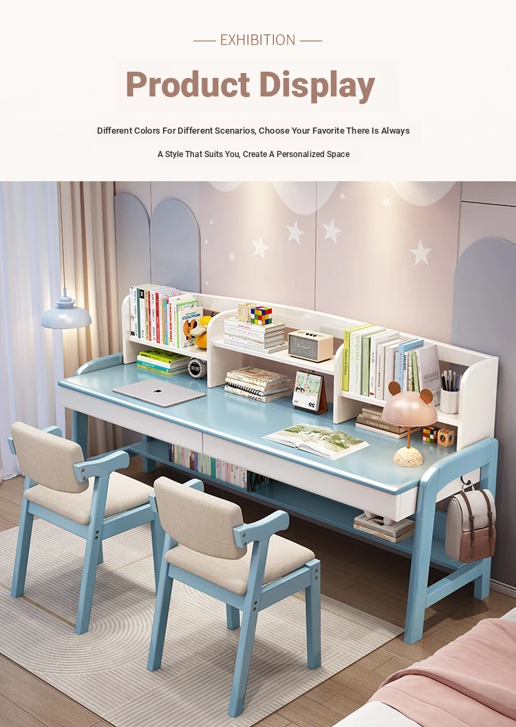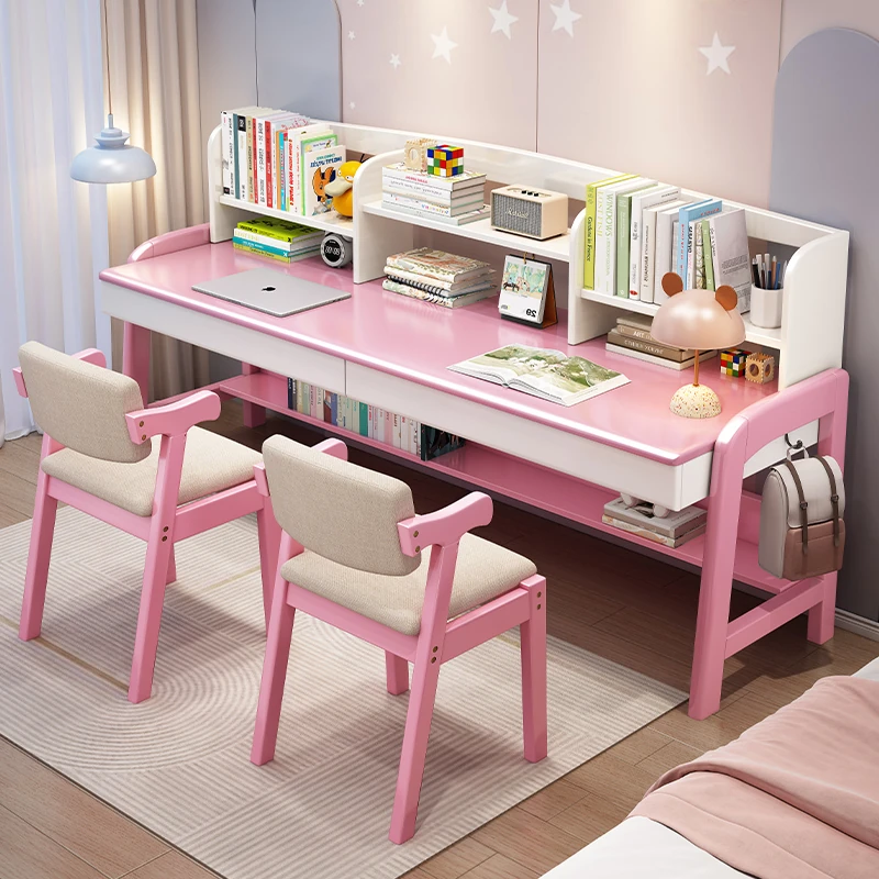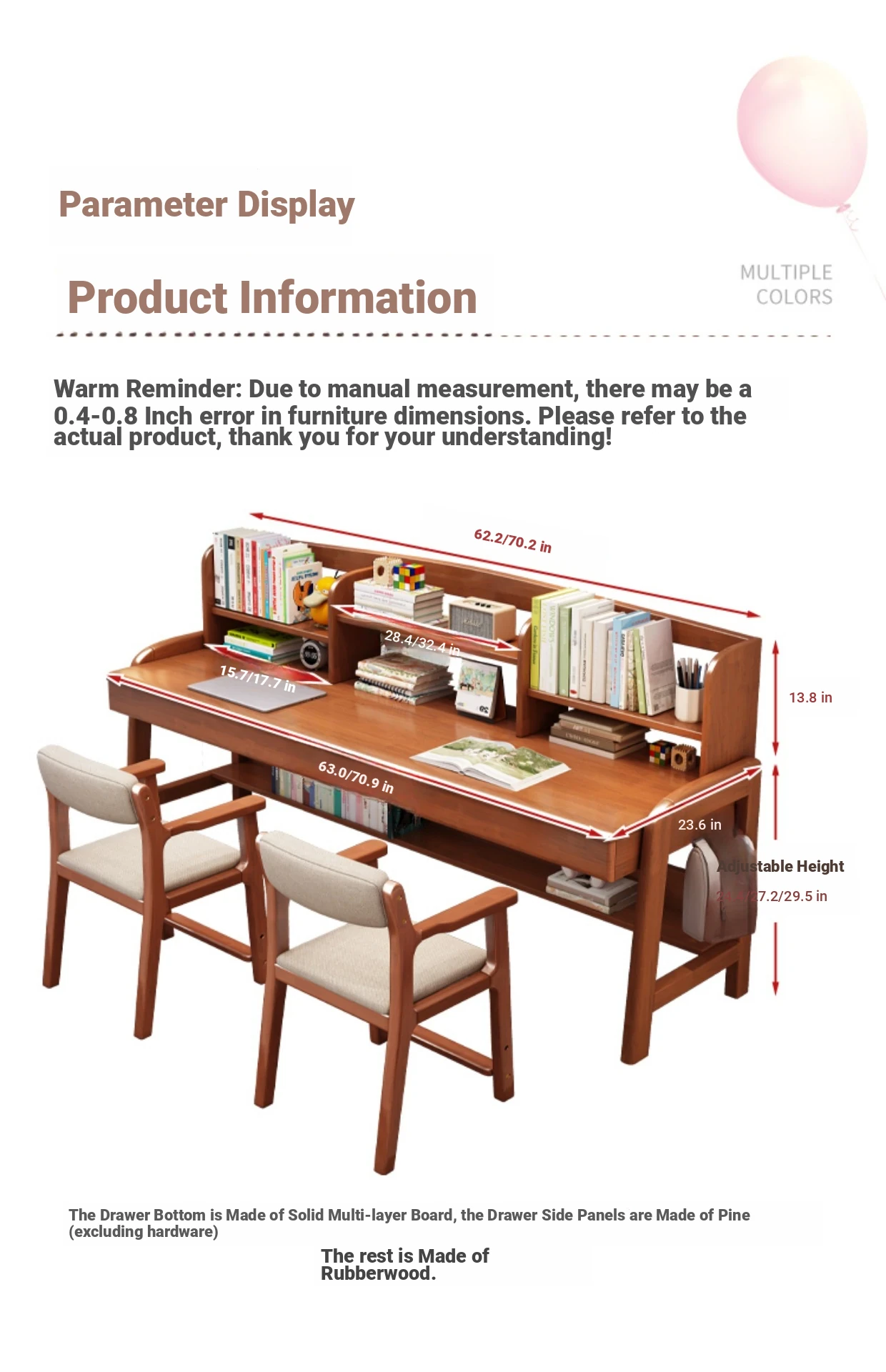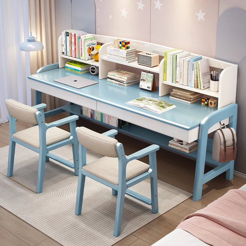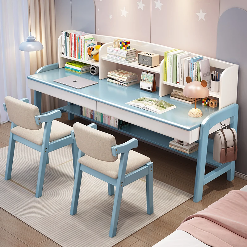 Extended Solid Wood Double Desk with Bookshelf - Ideal Learning Table for Kids and Teens, Perfect for Home or Living Room Use, Suitable for Writing and Study Sessions.