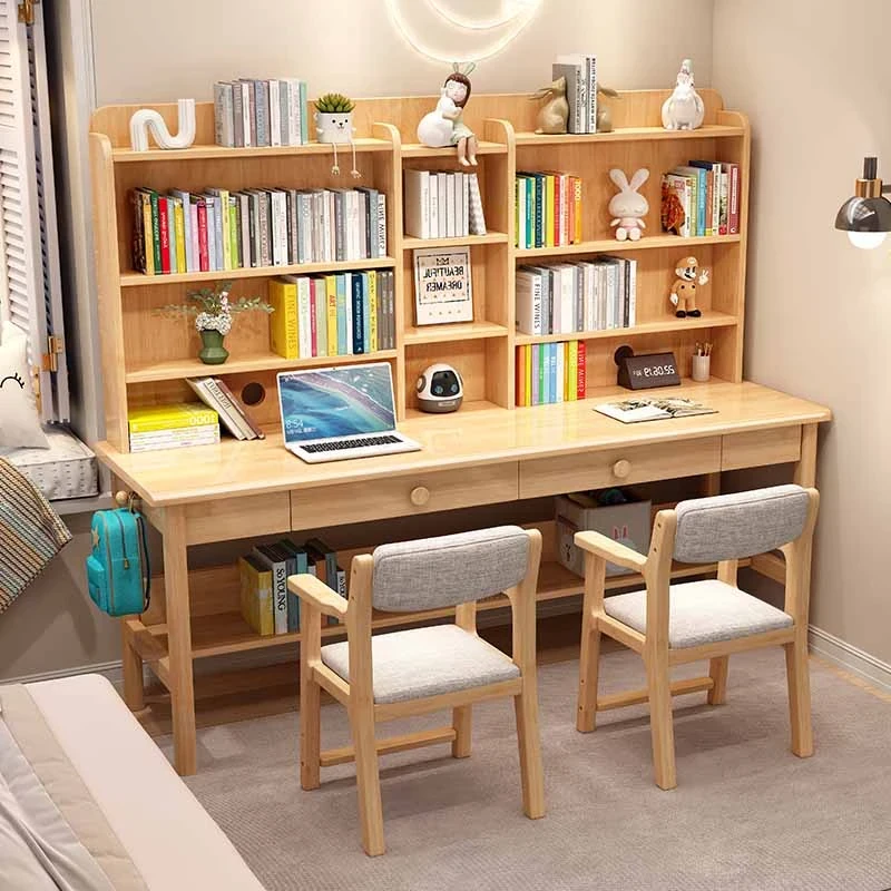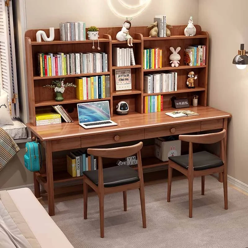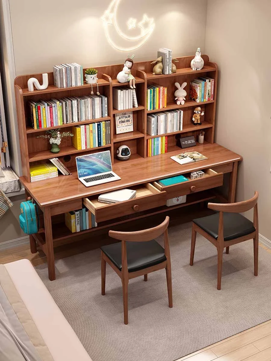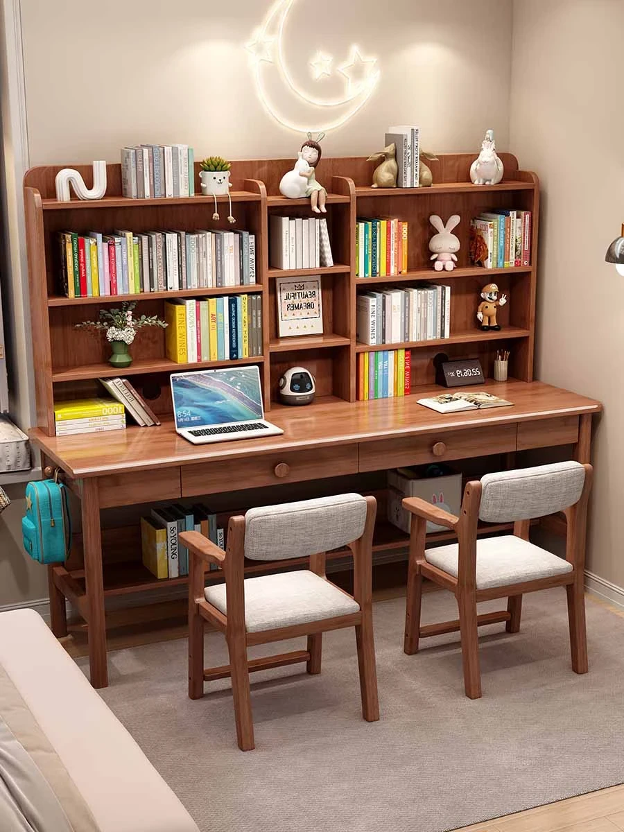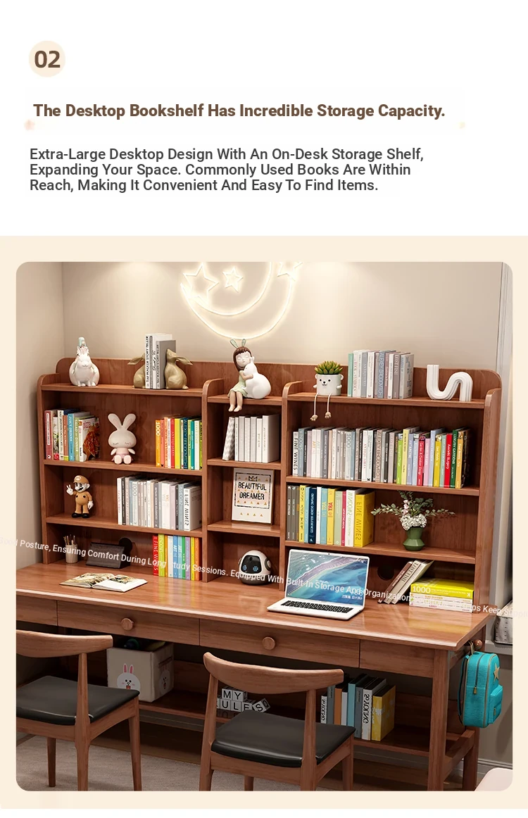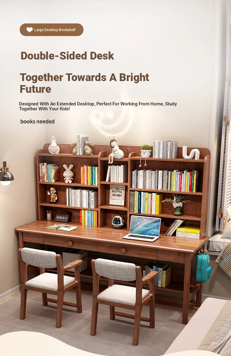 Optimize Solid Wood Double Writing Desk with Bookshelf for Kids - Perfect Study Table for Two Students in Bedrooms, Ideal for Elementary and Middle School Learning