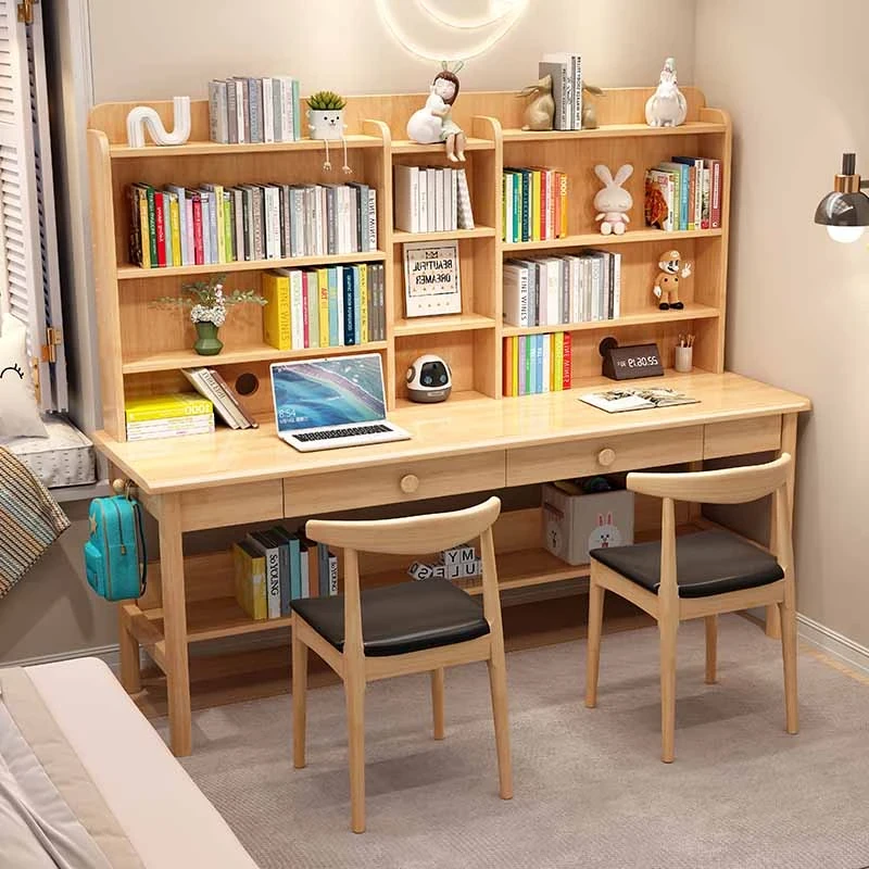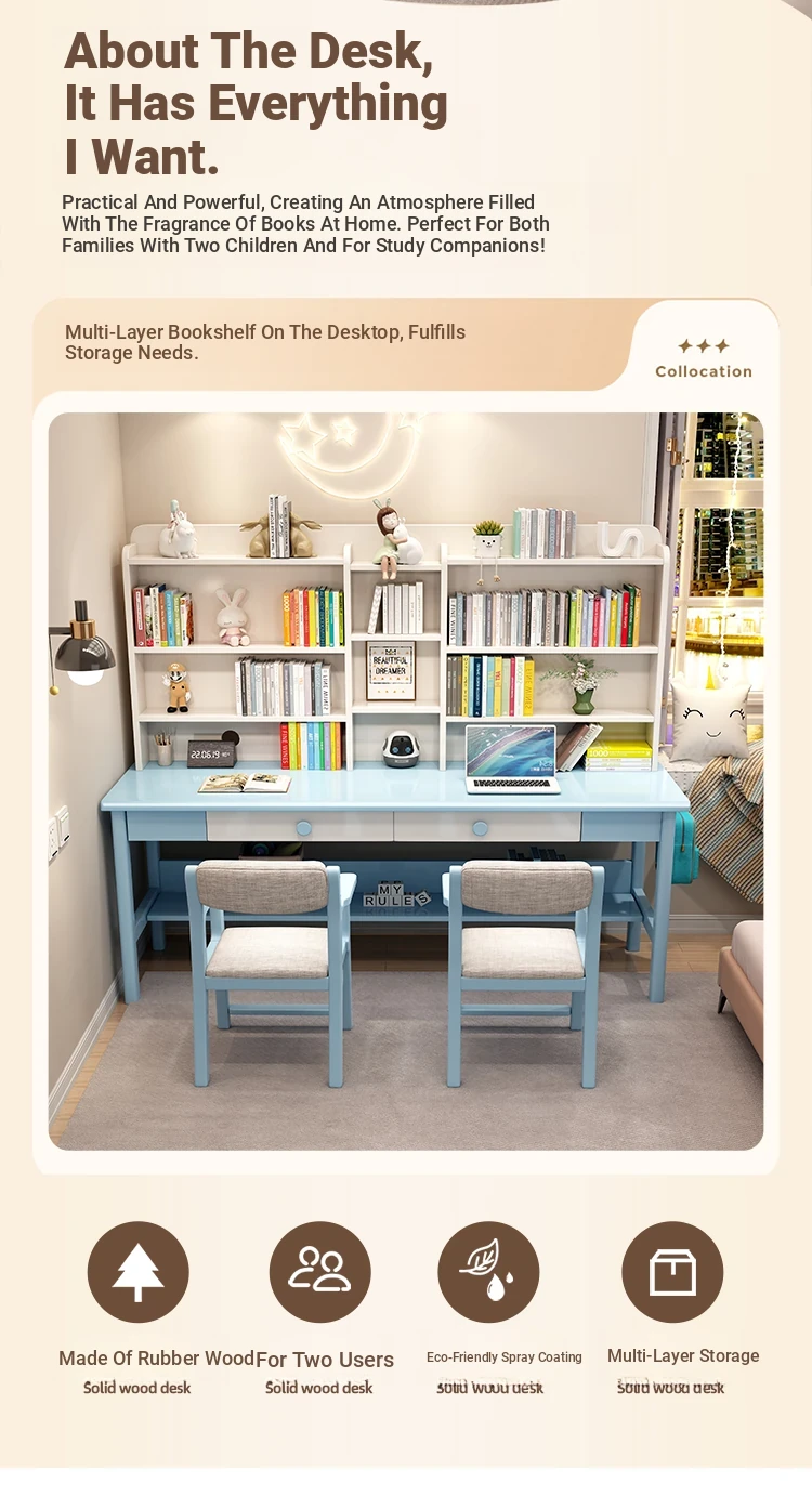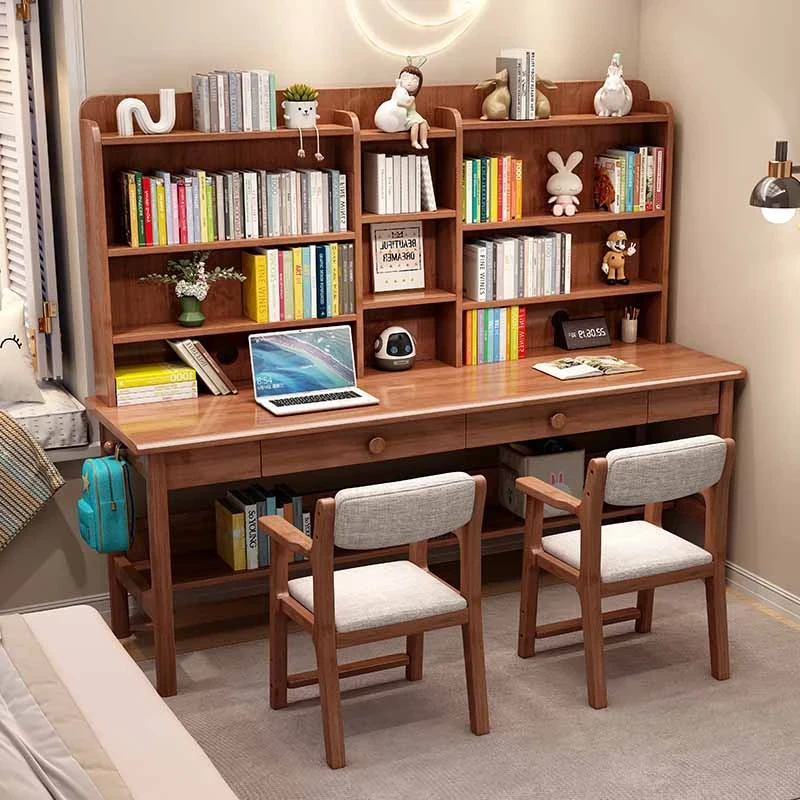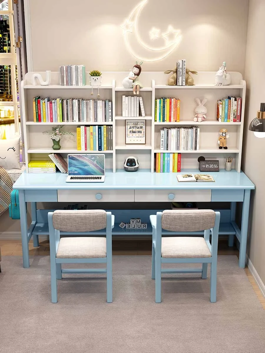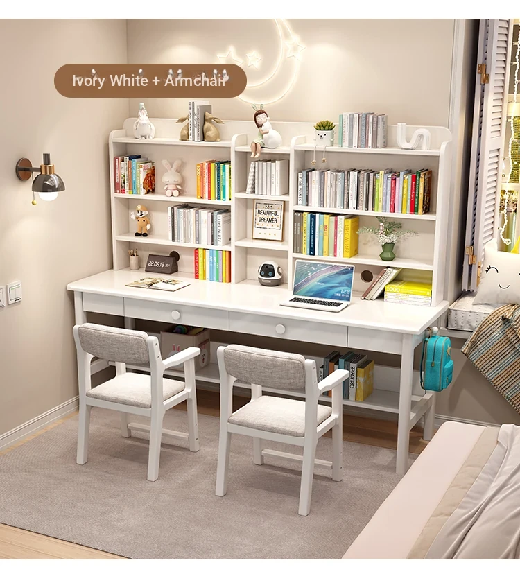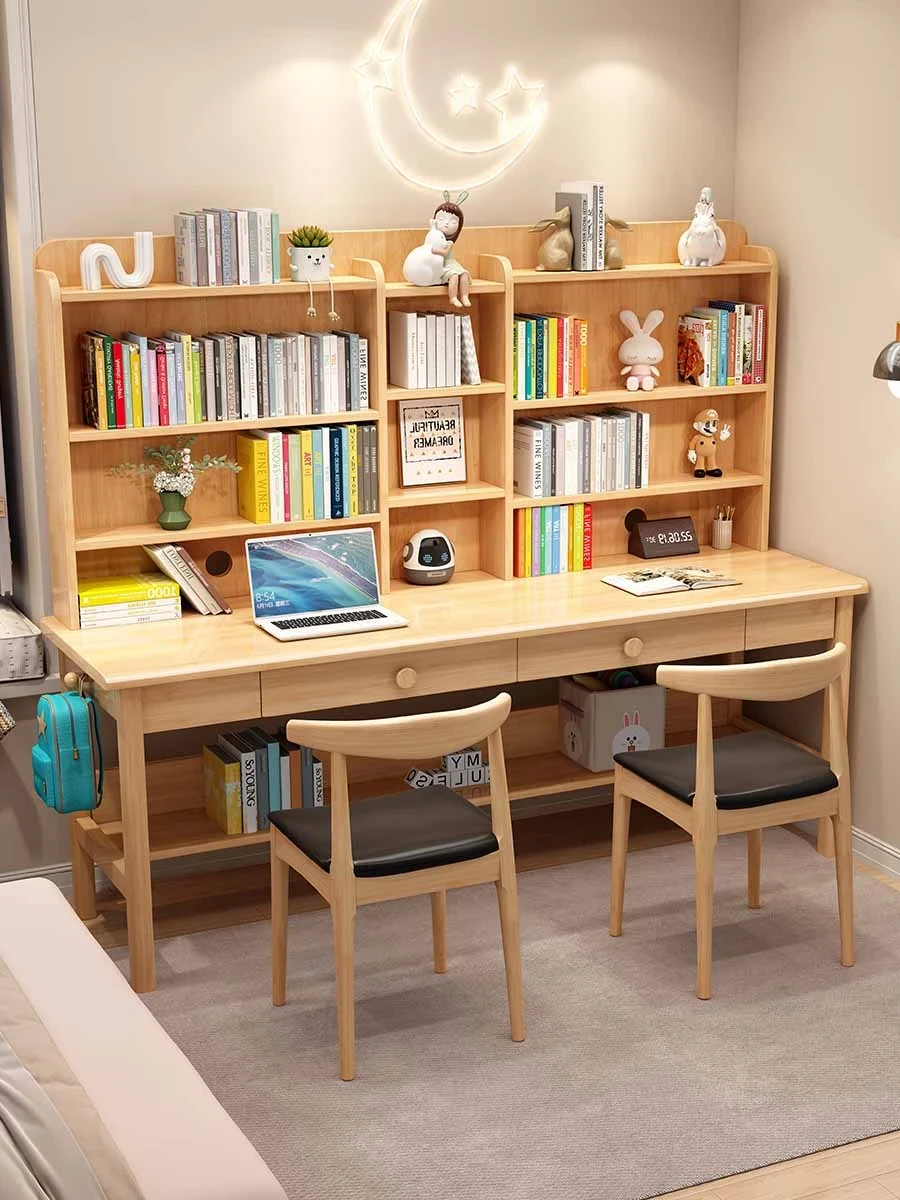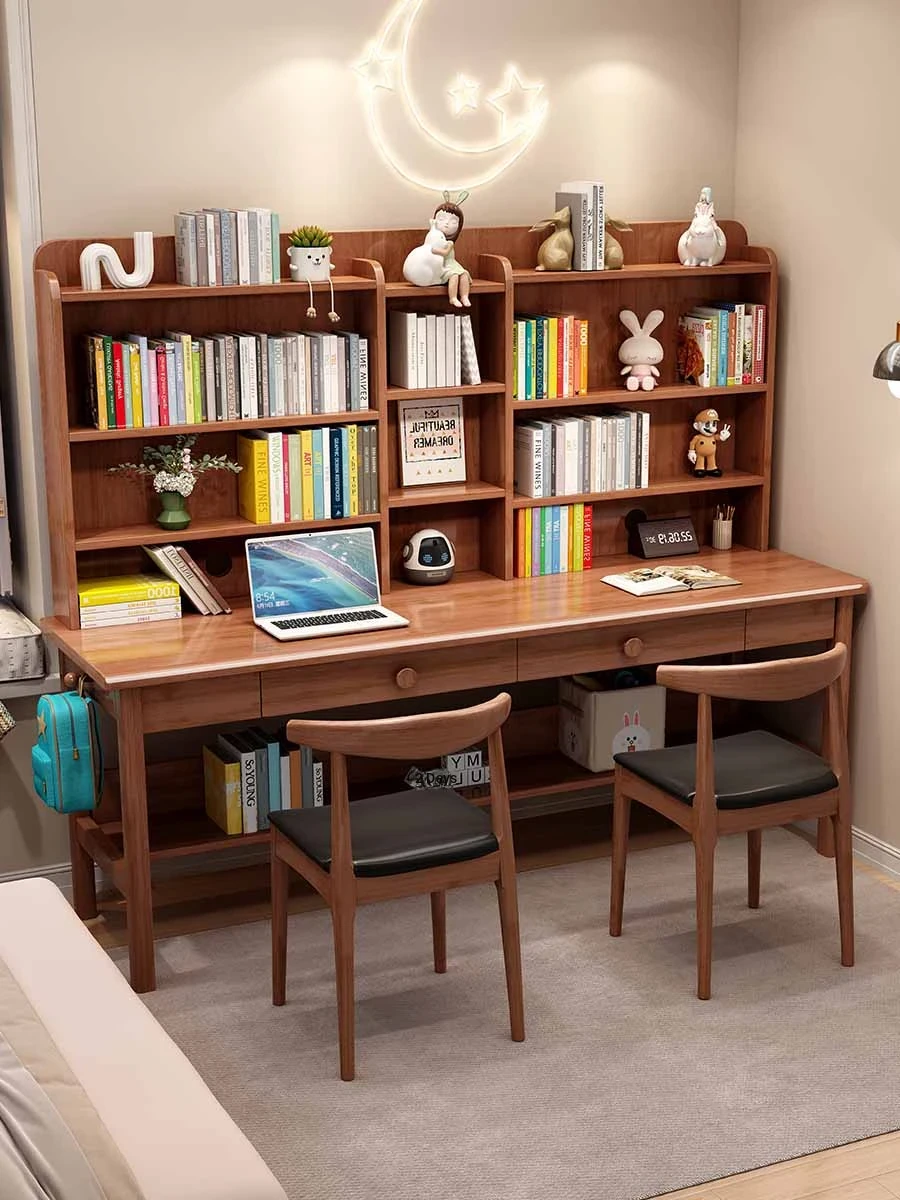 Optimize Solid Wood Double Writing Desk with Bookshelf for Kids - Perfect Study Table for Two Students in Bedrooms, Ideal for Elementary and Middle School Learning