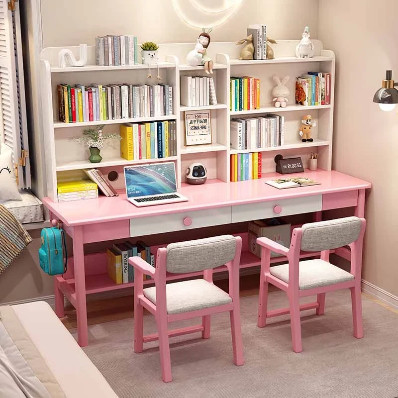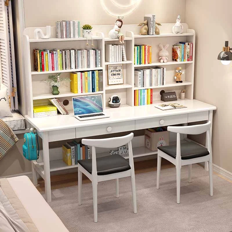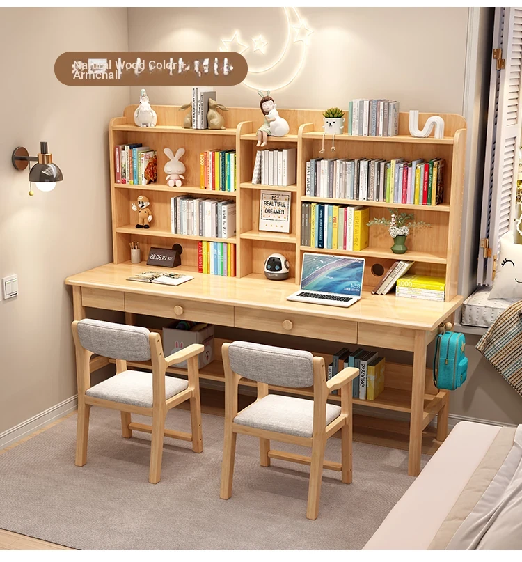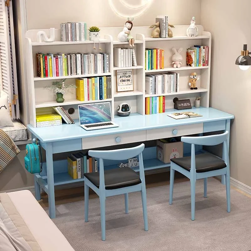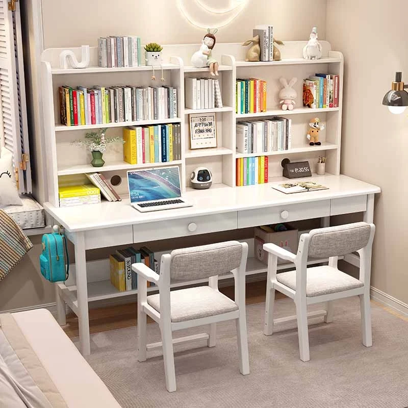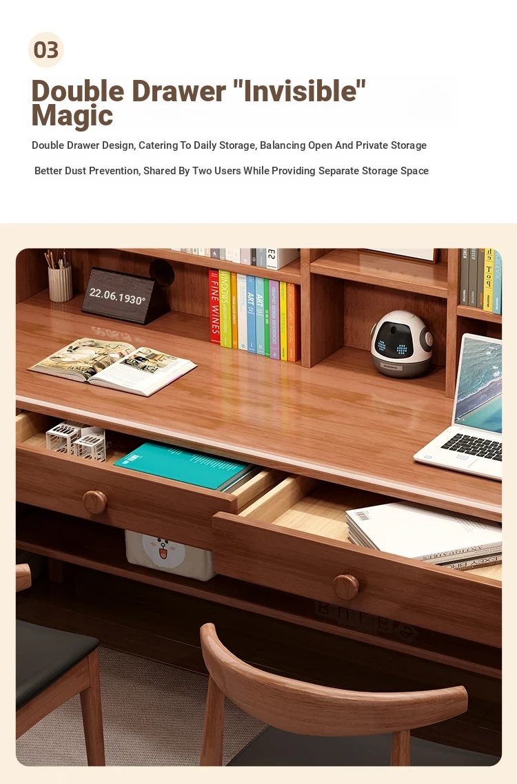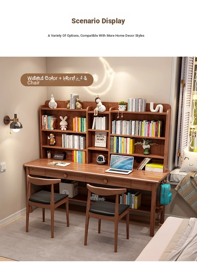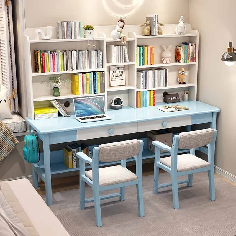 Optimize Solid Wood Double Writing Desk with Bookshelf for Kids - Perfect Study Table for Two Students in Bedrooms, Ideal for Elementary and Middle School Learning