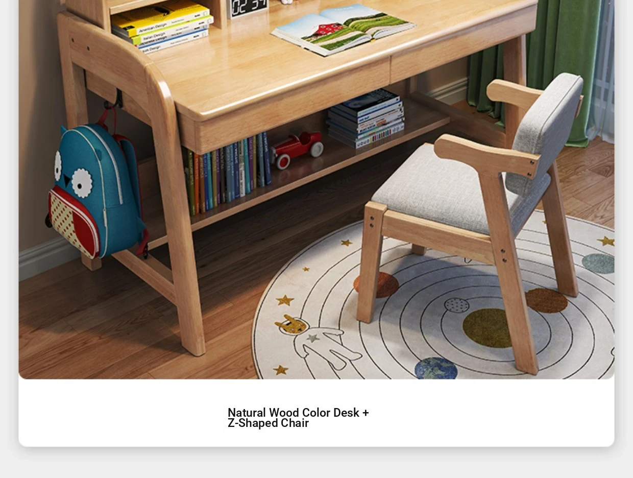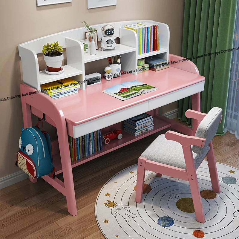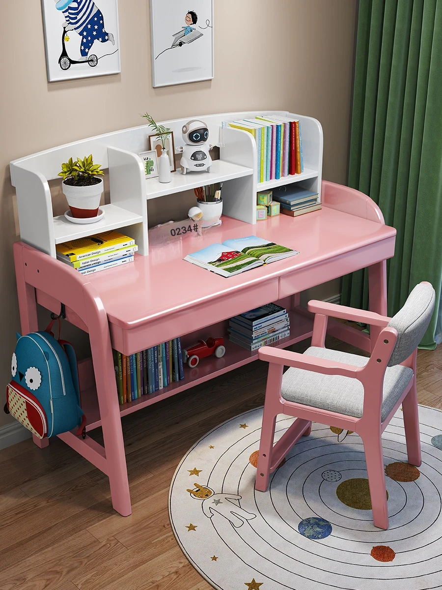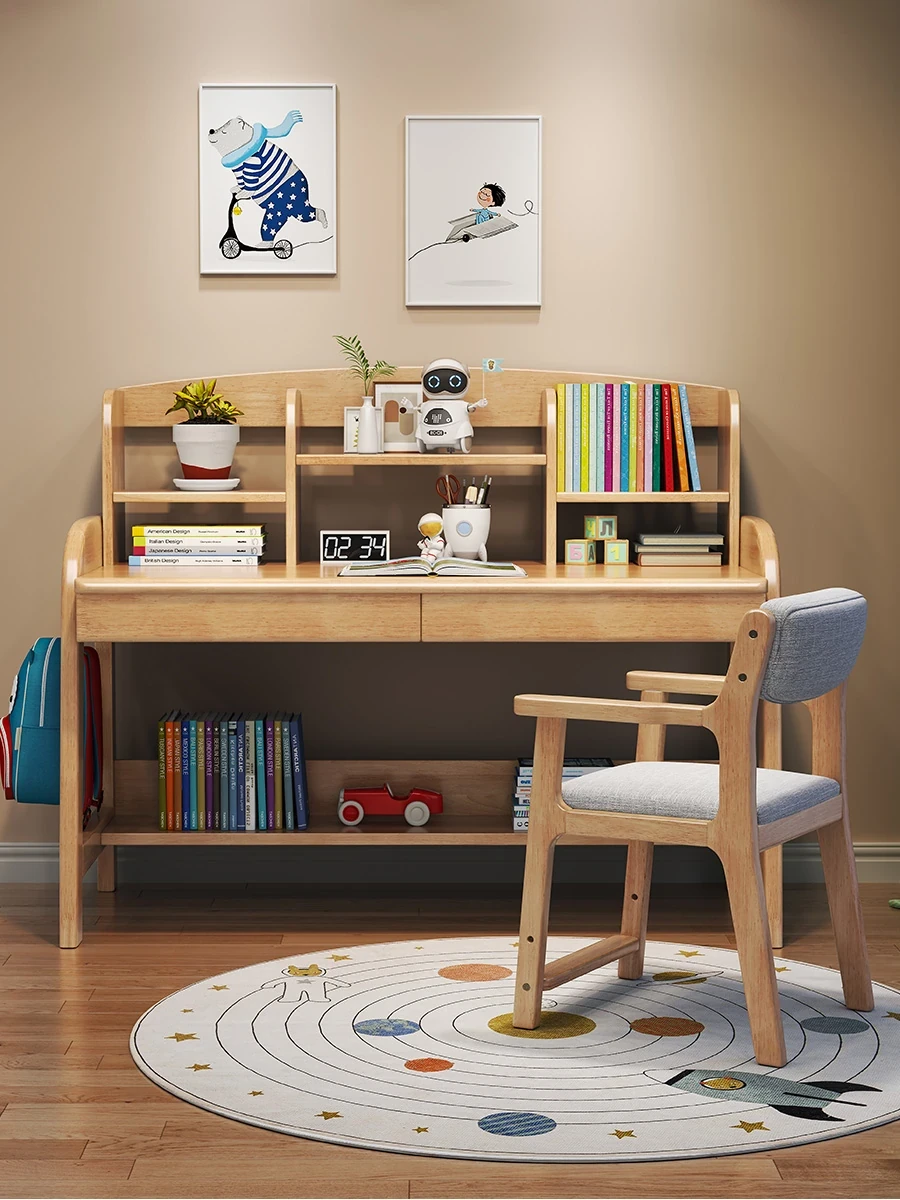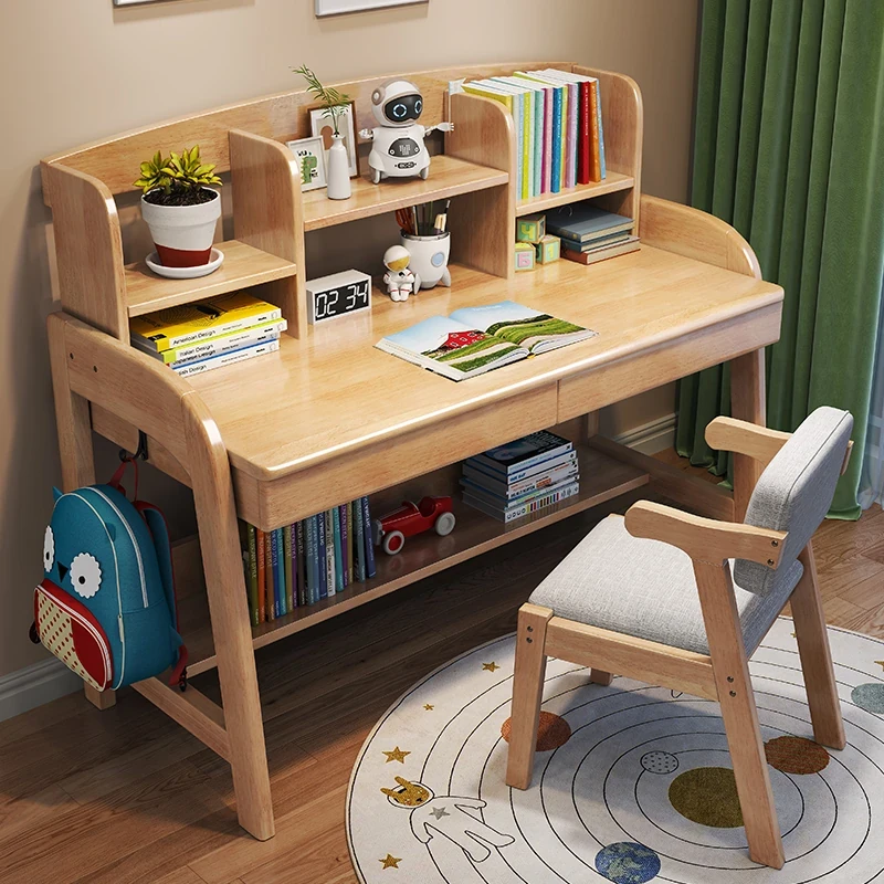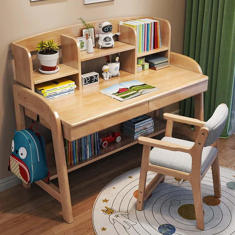 Solid Wood Children's Study Desk with Integrated Bookshelf - Adjustable Home Writing Desk Set for Middle School Students, Perfect for Bedrooms