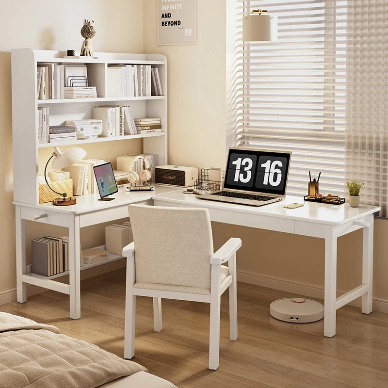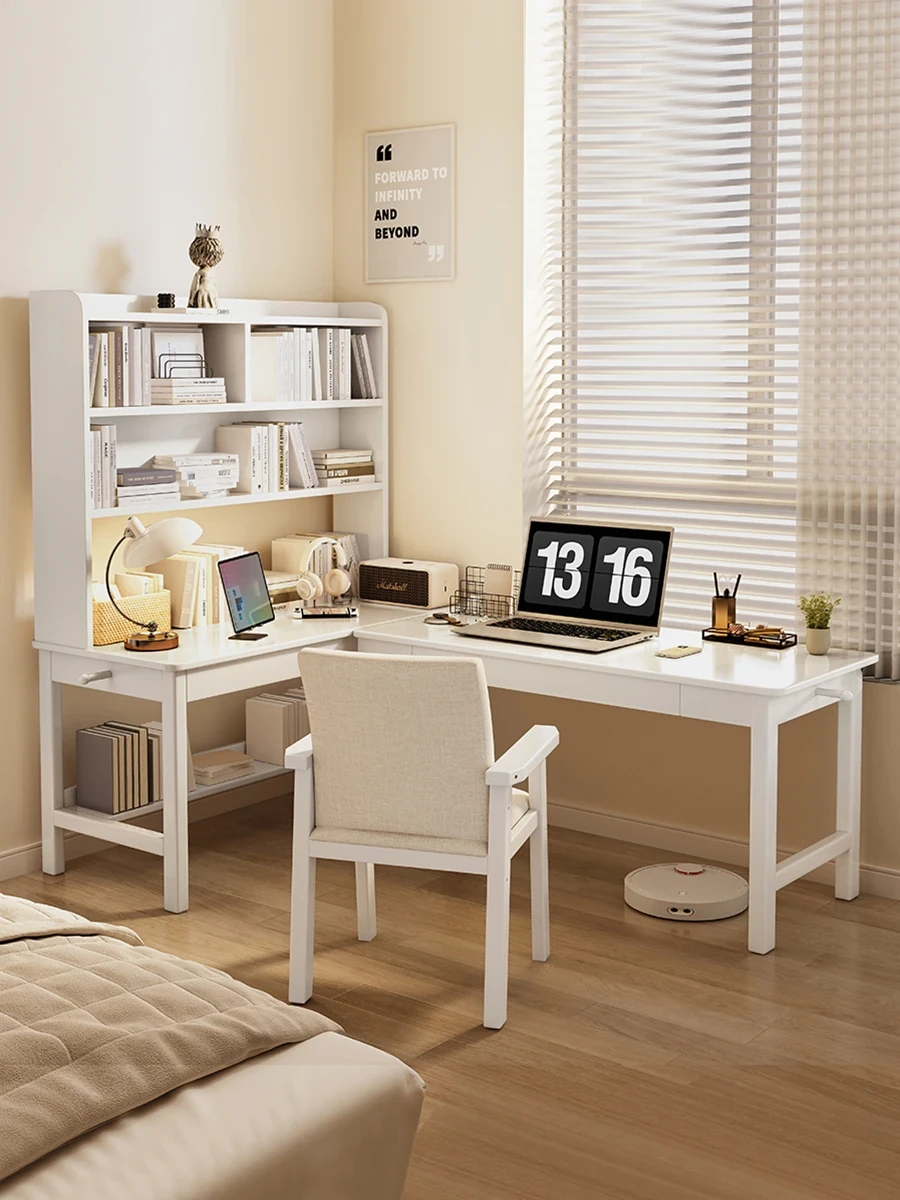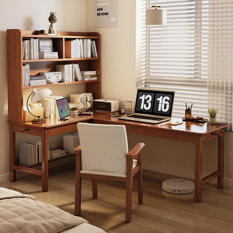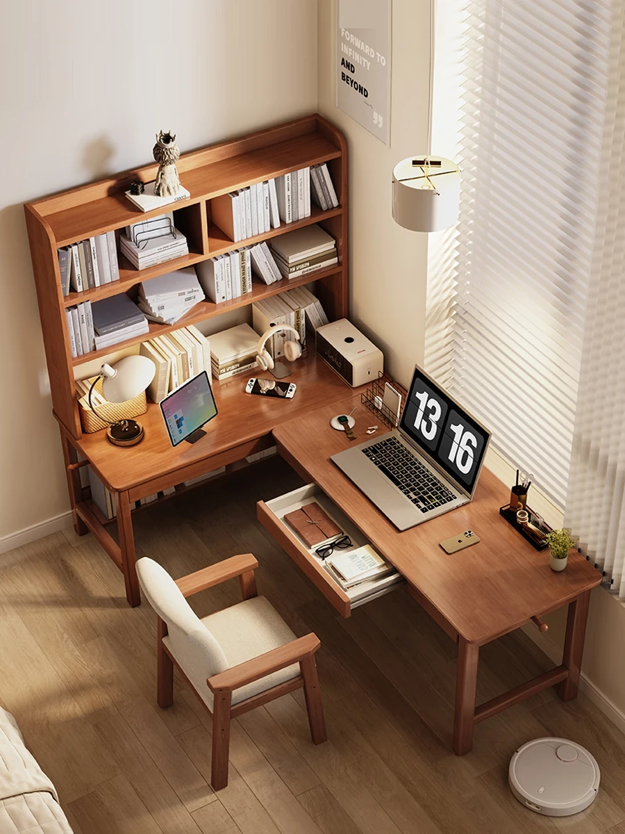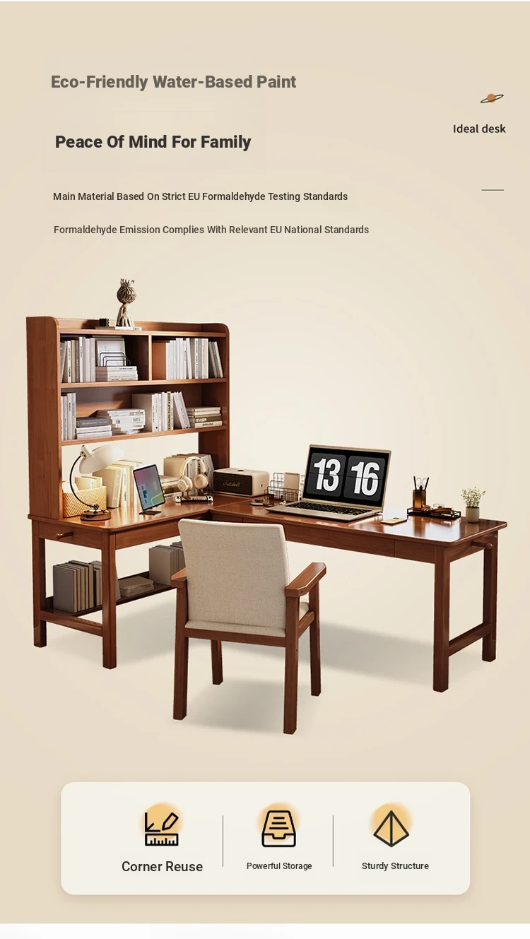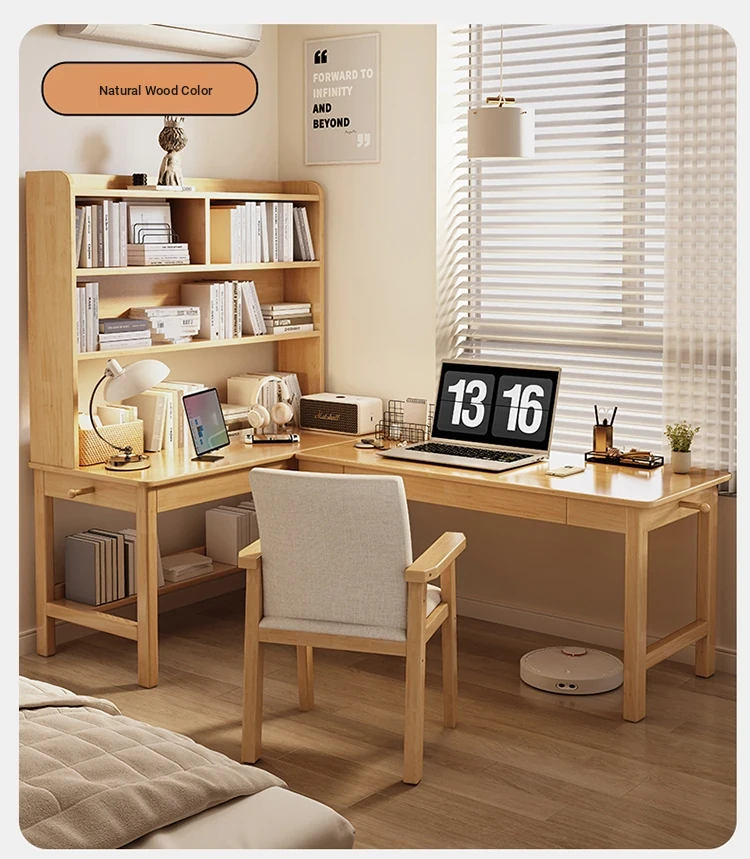 Solid Wood L-Shaped Corner Desk with Bookshelf – Stylish Computer Desk for Home Office, Simplistic Writing Table for Bedrooms and Student Study Sessions