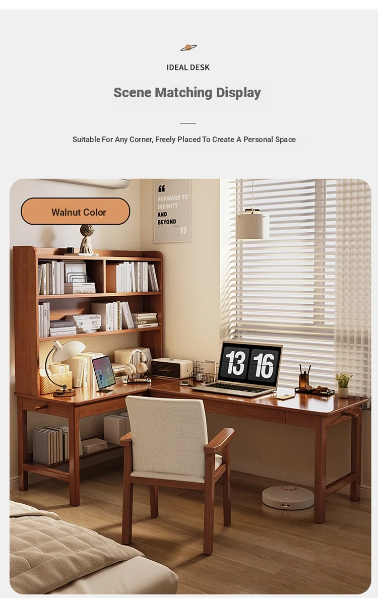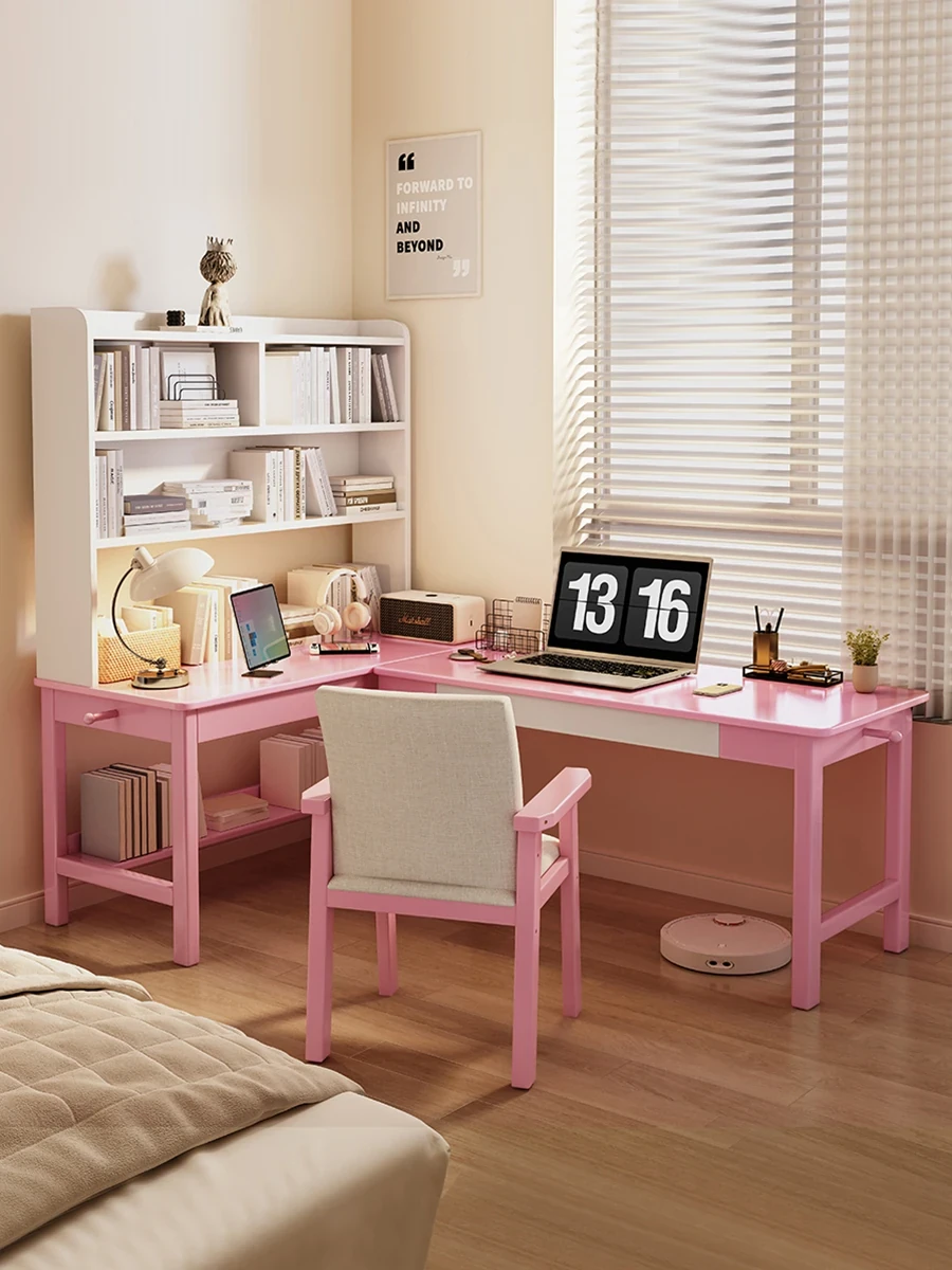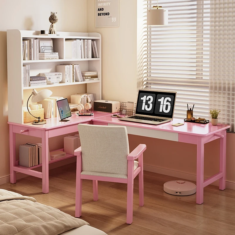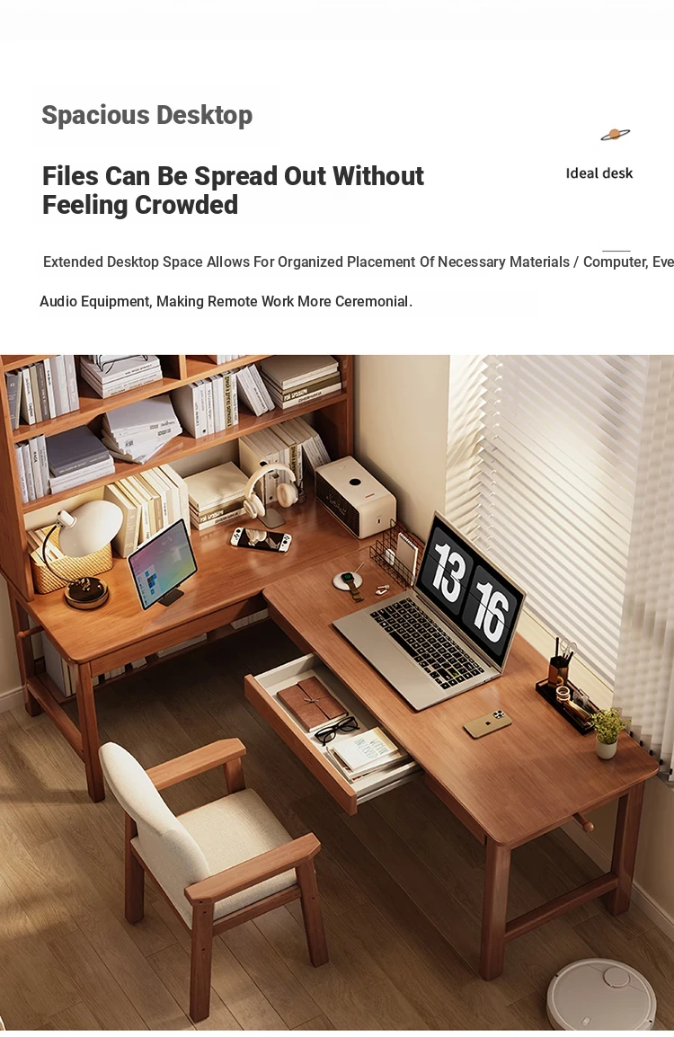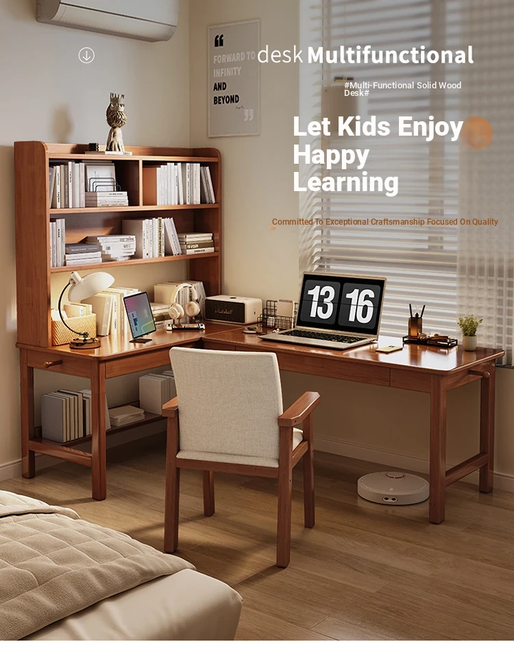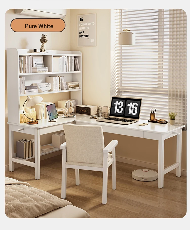 Solid Wood L-Shaped Corner Desk with Bookshelf – Stylish Computer Desk for Home Office, Simplistic Writing Table for Bedrooms and Student Study Sessions
