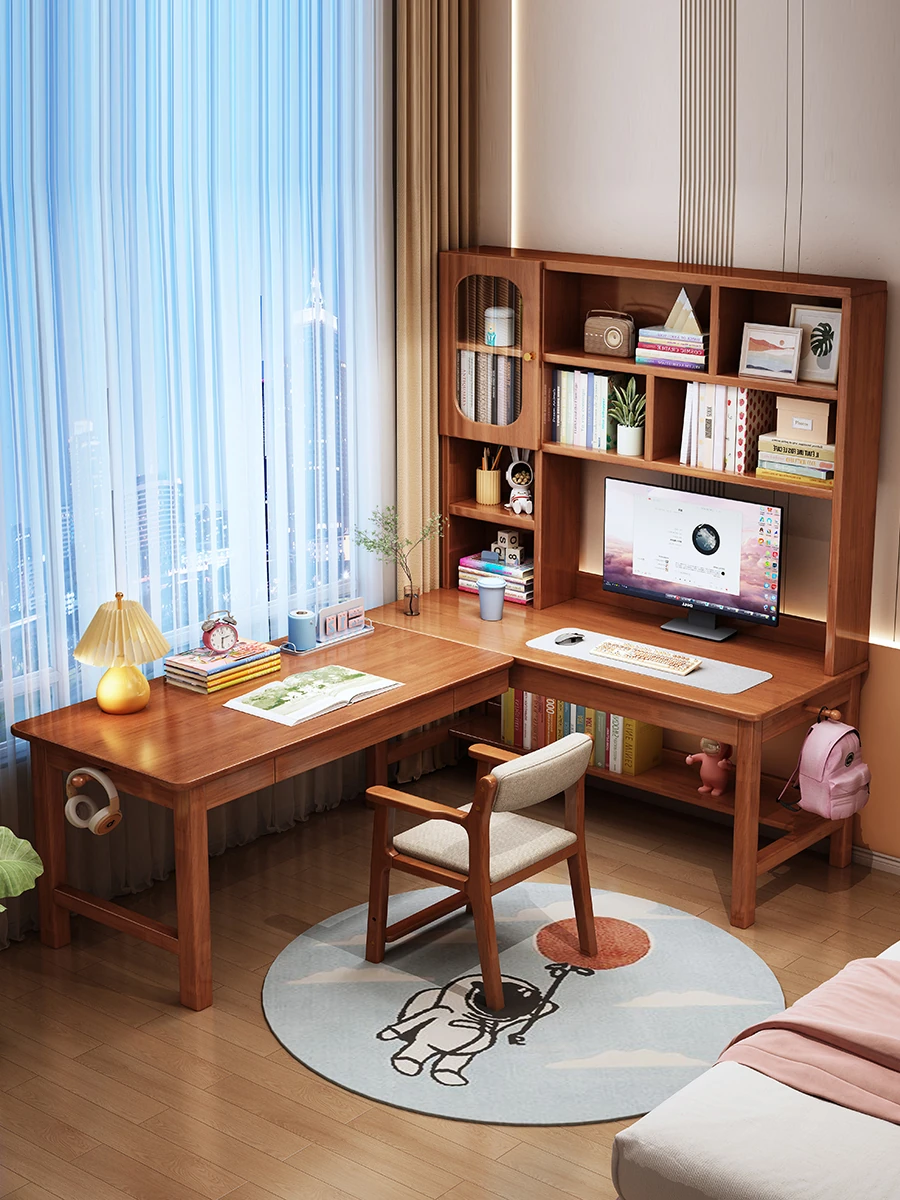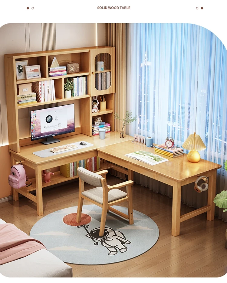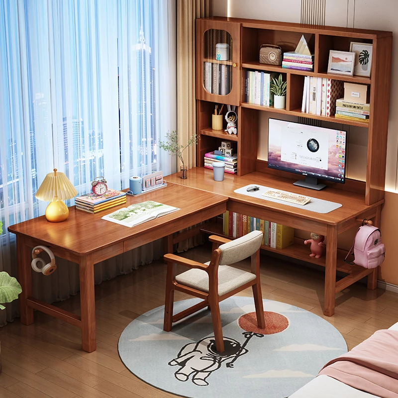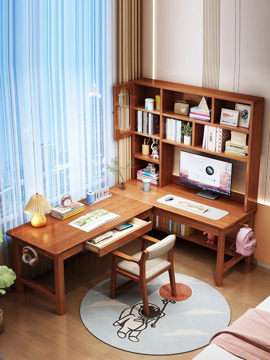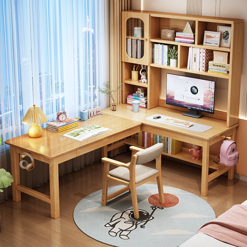Solid Wood L-Shaped Desk & Bookshelf Set - Kids' Study Table, Home Student Writing Desk, Corner Computer Desk for Home Office & Study Room