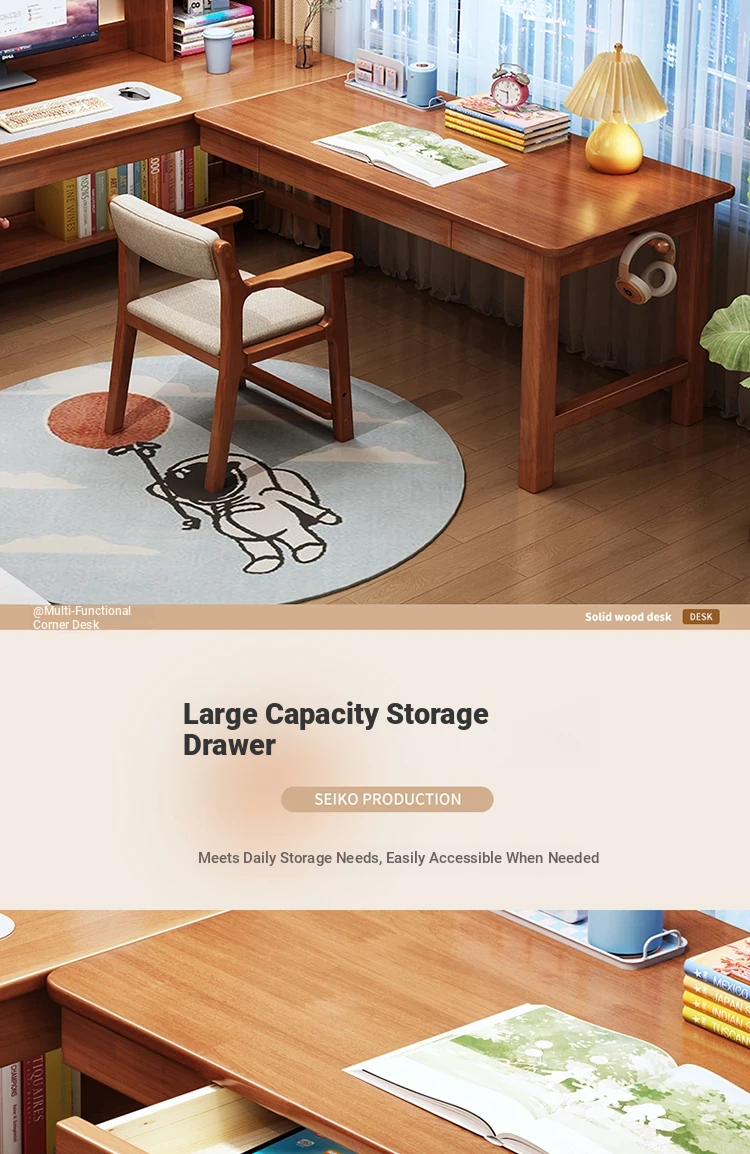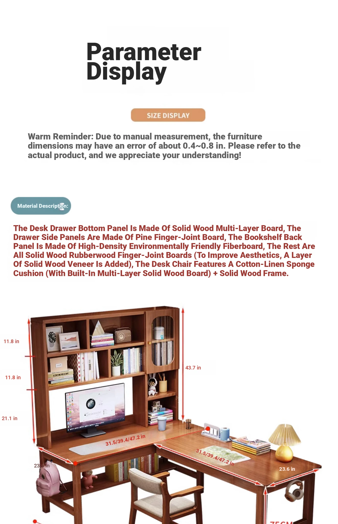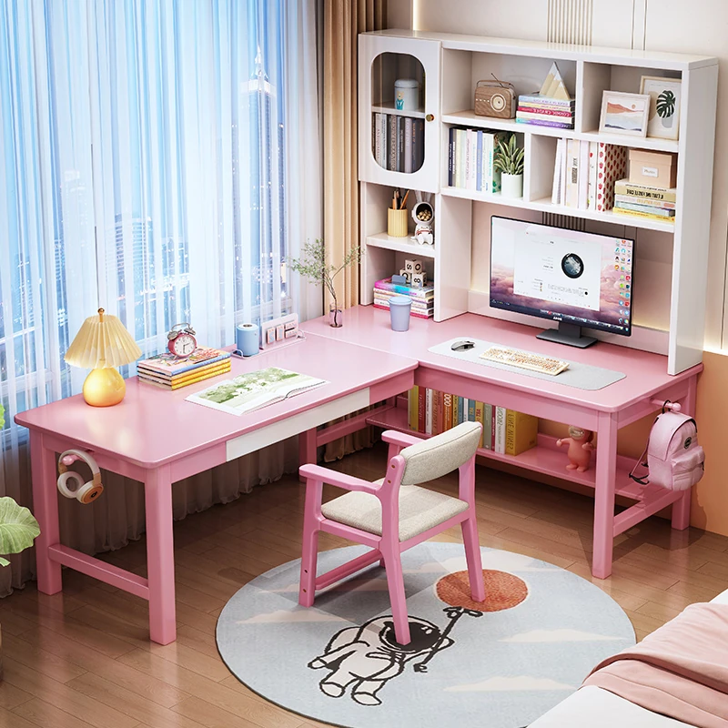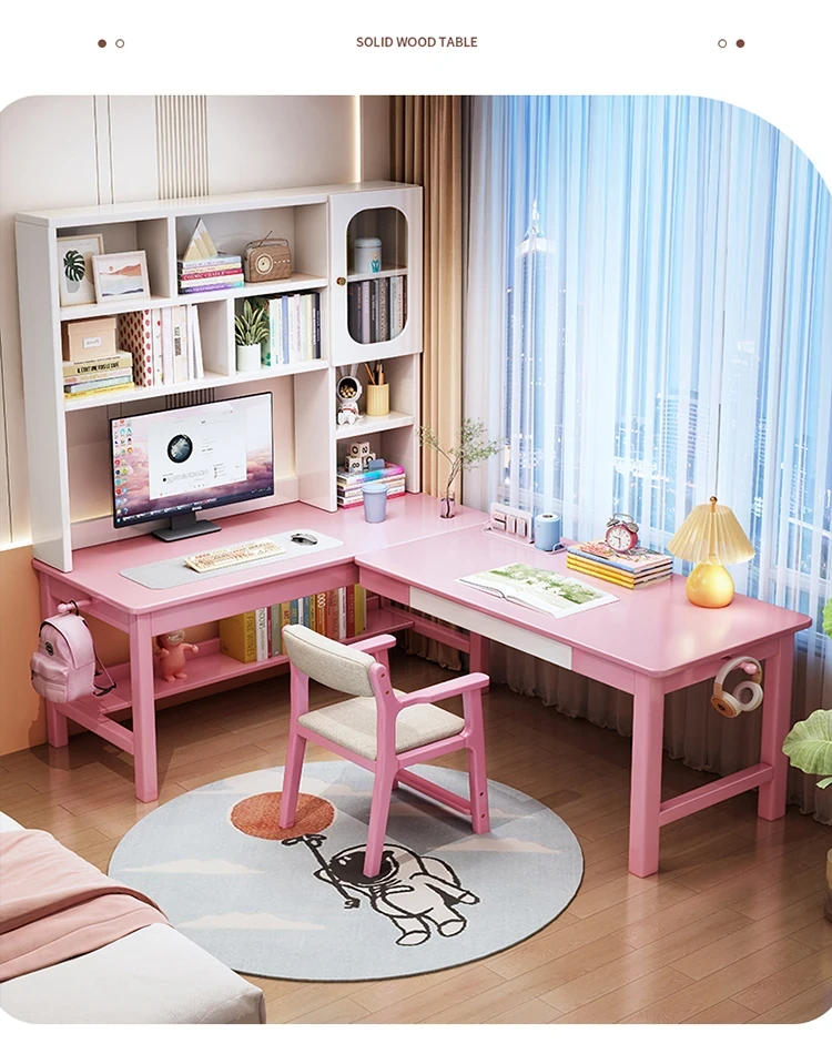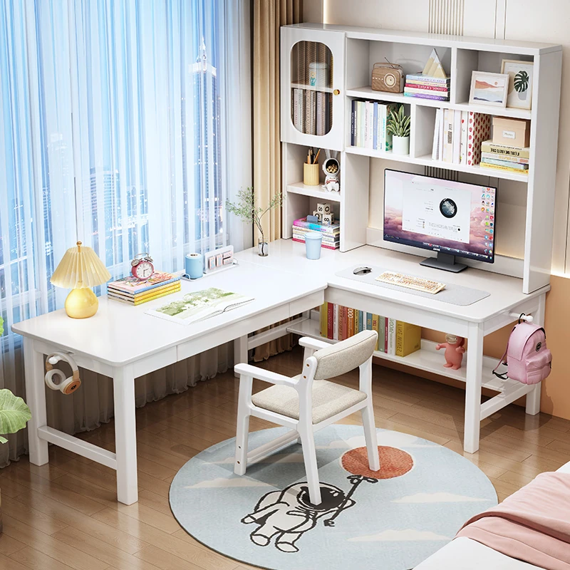 Solid Wood L-Shaped Desk & Bookshelf Set - Kids' Study Table, Home Student Writing Desk, Corner Computer Desk for Home Office & Study Room