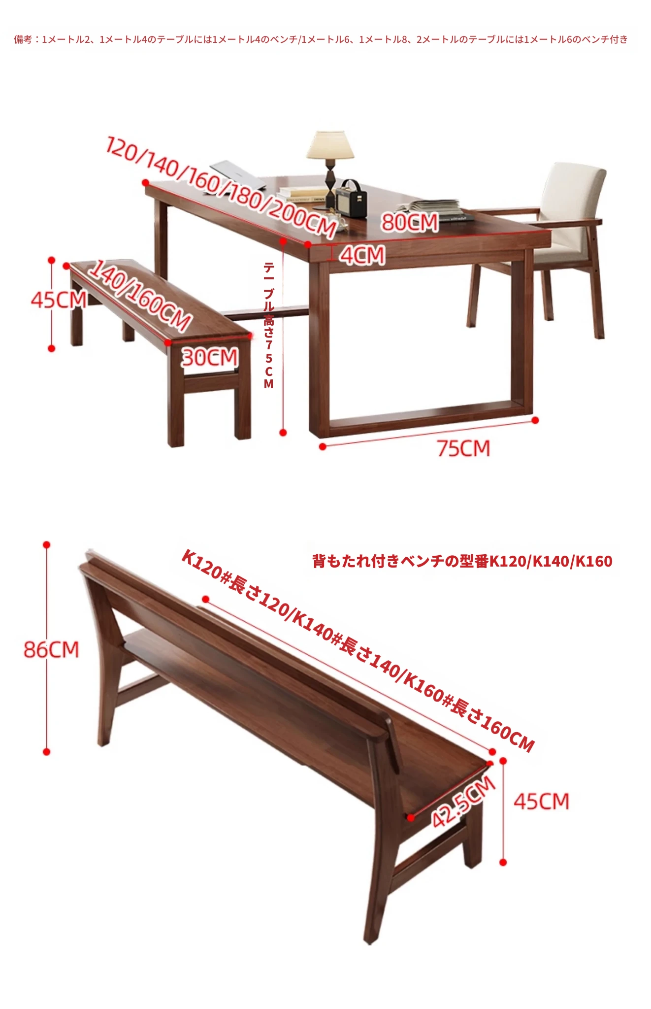 FJXDB02#ウォールナット色のテーブル+K160#長ベンチ1台 他の色をご注文の際は備考欄にご記入ください